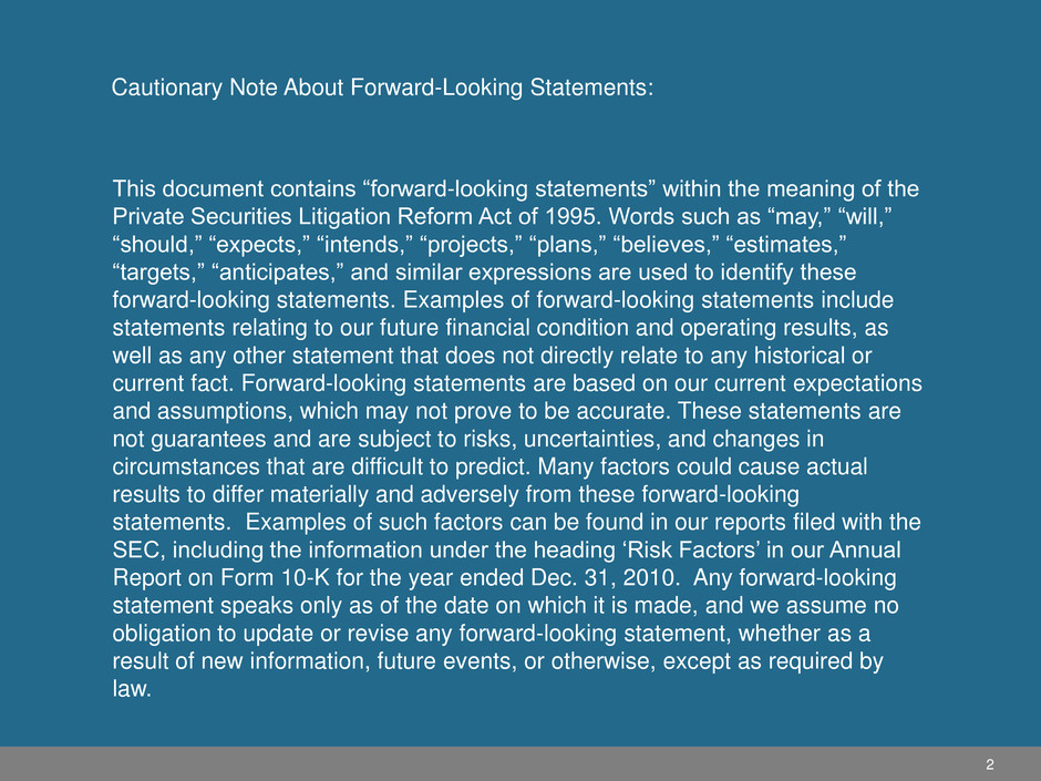 Cautionary Note About Forward-Looking Statements: 2 This document contains “forward-looking statements” within the meaning of the Private Securities Litigation Reform Act of 1995. Words such as “may,” “will,” “should,” “expects,” “intends,” “projects,” “plans,” “believes,” “estimates,” “targets,” “anticipates,” and similar expressions are used to identify these forward-looking statements. Examples of forward-looking statements include statements relating to our future financial condition and operating results, as well as any other statement that does not directly relate to any historical or current fact. Forward-looking statements are based on our current expectations and assumptions, which may not prove to be accurate. These statements are not guarantees and are subject to risks, uncertainties, and changes in circumstances that are difficult to predict. Many factors could cause actual results to differ materially and adversely from these forward-looking statements. Examples of such factors can be found in our reports filed with the SEC, including the information under the heading „Risk Factors‟ in our Annual Report on Form 10-K for the year ended Dec. 31, 2010. Any forward-looking statement speaks only as of the date on which it is made, and we assume no obligation to update or revise any forward-looking statement, whether as a result of new information, future events, or otherwise, except as required by law.