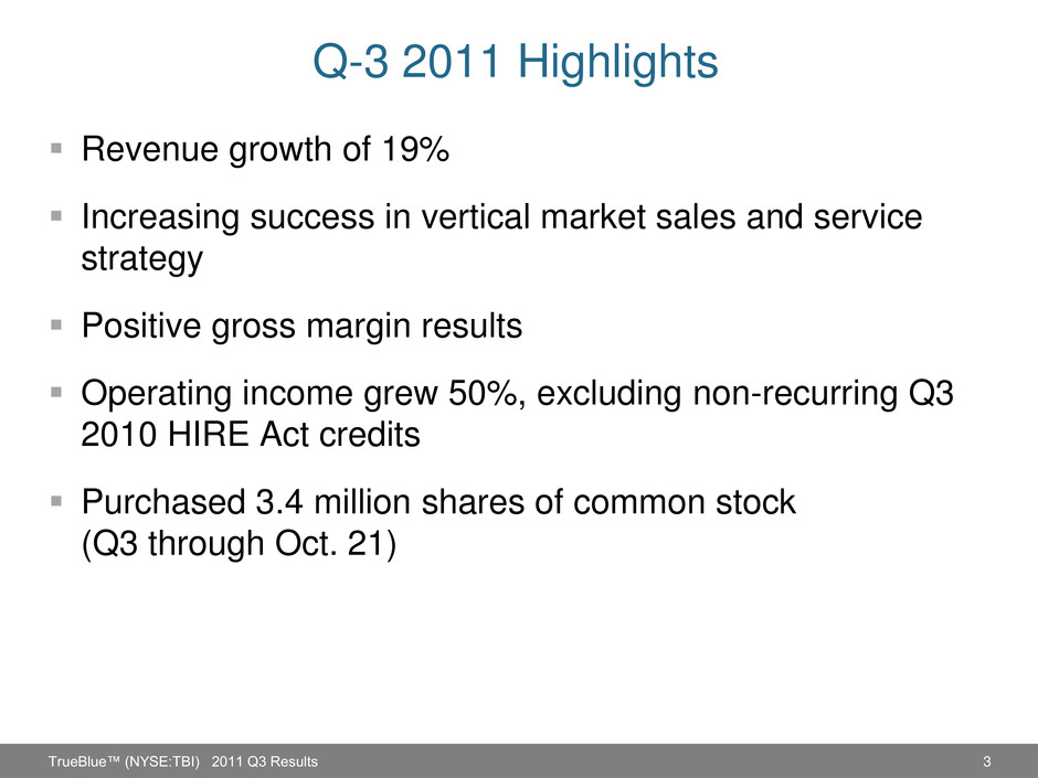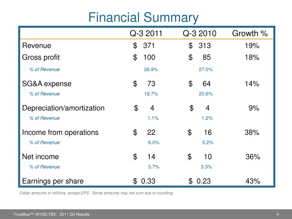 3 Q-3 2011 Highlights Revenue growth of 19% Increasing success in vertical market sales and service strategy Positive gross margin results Operating income grew 50%, excluding non-recurring Q3 2010 HIRE Act credits Purchased 3.4 million shares of common stock (Q3 through Oct. 21) TrueBlue™ (NYSE:TBI) 2011 Q3 Results