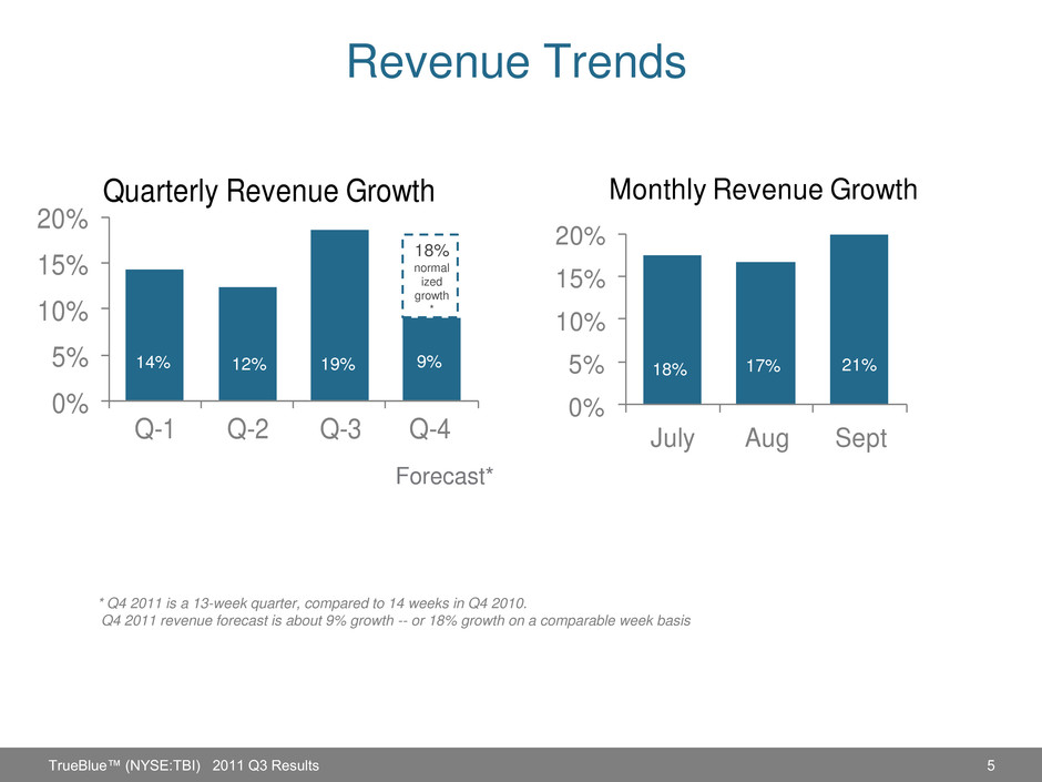 4 Financial Summary Q-3 2011 Q-3 2010 Growth % Revenue $ 371 $ 313 19% Gross profit $ 100 $ 85 18% % of Revenue 26.9% 27.0% SG&A expense $ 73 $ 64 14% % of Revenue 19.7% 20.6% Depreciation/amortization $ 4 $ 4 9% % of Revenue 1.1% 1.2% Income from operations $ 22 $ 16 38% % of Revenue 6.0% 5.2% Net income $ 14 $ 10 36% % of Revenue 3.7% 3.3% Earnings per share $ 0.33 $ 0.23 43% TrueBlue™ (NYSE:TBI) 2011 Q3 Results Dollar amounts in millions, except EPS. Some amounts may not sum due to rounding.