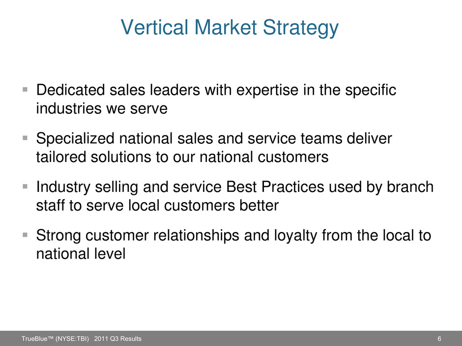 Revenue Trends 0% 5% 10% 15% 20% July Aug Sept Monthly Revenue Growth 0% 5% 10% 15% 20% Q-1 Q-2 Q-3 Q-4 Quarterly Revenue Growth TrueBlue™ (NYSE:TBI) 2011 Q3 Results 12% 21% 17% 18% 5 14% 19% 9% Forecast* 18% normal ized growth * * Q4 2011 is a 13-week quarter, compared to 14 weeks in Q4 2010. Q4 2011 revenue forecast is about 9% growth -- or 18% growth on a comparable week basis