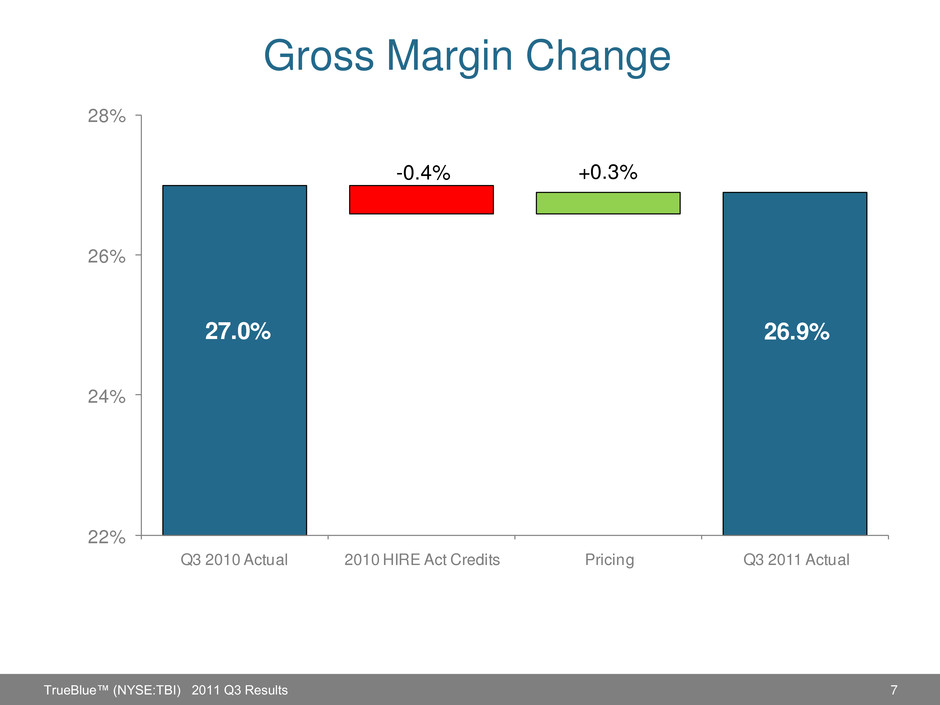 6 Vertical Market Strategy Dedicated sales leaders with expertise in the specific industries we serve Specialized national sales and service teams deliver tailored solutions to our national customers Industry selling and service Best Practices used by branch staff to serve local customers better Strong customer relationships and loyalty from the local to national level TrueBlue™ (NYSE:TBI) 2011 Q3 Results