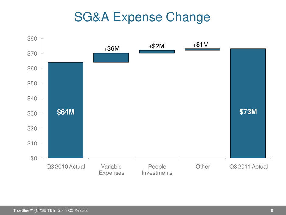 7 Gross Margin Change TrueBlue™ (NYSE:TBI) 2011 Q3 Results 22% 24% 26% 28% Q3 2010 Actual 2010 HIRE Act Credits Pricing Q3 2011 Actual 27.0% 26.9% +0.3%-0.4%