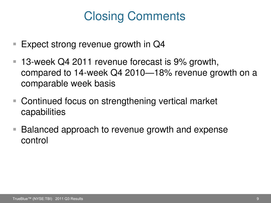 8 SG&A Expense Change TrueBlue™ (NYSE:TBI) 2011 Q3 Results $0 $10 $20 $30 $40 $50 $60 $70 $80 Q3 2010 Actual Variable Expenses People Investments Other Q3 2011 Actual +$6M $64M +$2M +$1M $73M