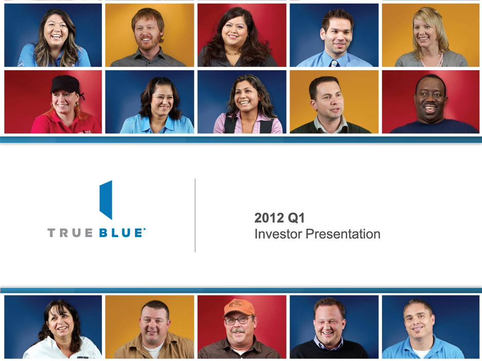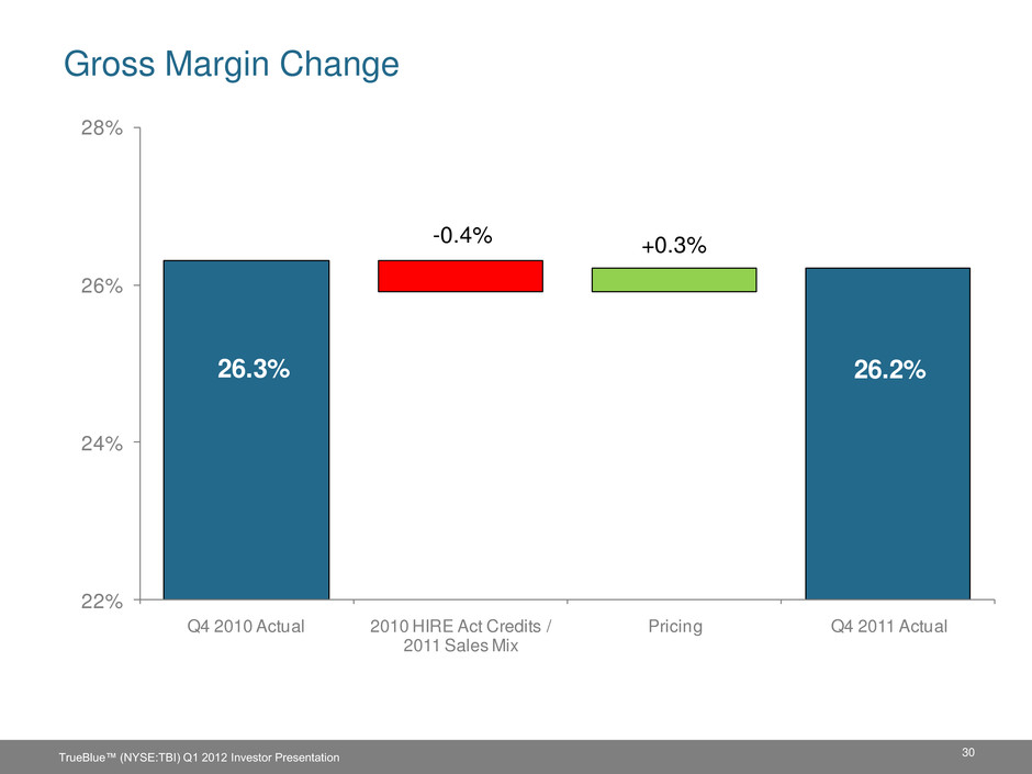 29 Financial Summary Q-4 2011 Q-4 2010 Growth % Revenue $ 350 $ 312 12% Gross profit $ 92 $ 82 12% % of Revenue 26.2% 26.3% SG&A expense $ 77 $ 72 7% % of Revenue 21.9% 23.0% Depreciation/amortization $ 4 $ 5 -4% % of Revenue 1.3% 1.5% Income from operations $ 11 $ 6 93% % of Revenue 3.1% 1.8% Net income $ 8 $ 4 91% % of Revenue 2.2% 1.3% Earnings per share $ 0.19 $ 0.09 110% Dollar amounts in millions, except EPS. Some amounts may not sum due to rounding. TrueBlue™ (NYSE:TBI) Q1 2012 Investor Presentation