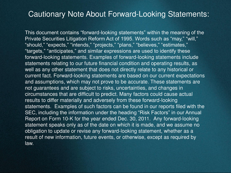 This document contains “forward-looking statements” within the meaning of the Private Securities Litigation Reform Act of 1995. Words such as “may,” “will,” “should,” “expects,” “intends,” “projects,” “plans,” “believes,” “estimates,” “targets,” “anticipates,” and similar expressions are used to identify these forward-looking statements. Examples of forward-looking statements include statements relating to our future financial condition and operating results, as well as any other statement that does not directly relate to any historical or current fact. Forward-looking statements are based on our current expectations and assumptions, which may not prove to be accurate. These statements are not guarantees and are subject to risks, uncertainties, and changes in circumstances that are difficult to predict. Many factors could cause actual results to differ materially and adversely from these forward-looking statements. Examples of such factors can be found in our reports filed with the SEC, including the information under the heading “Risk Factors” in our Annual Report on Form 10-K for the year ended Dec. 30, 2011. Any forward-looking statement speaks only as of the date on which it is made, and we assume no obligation to update or revise any forward-looking statement, whether as a result of new information, future events, or otherwise, except as required by law. Cautionary Note About Forward-Looking Statements: