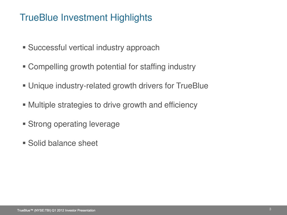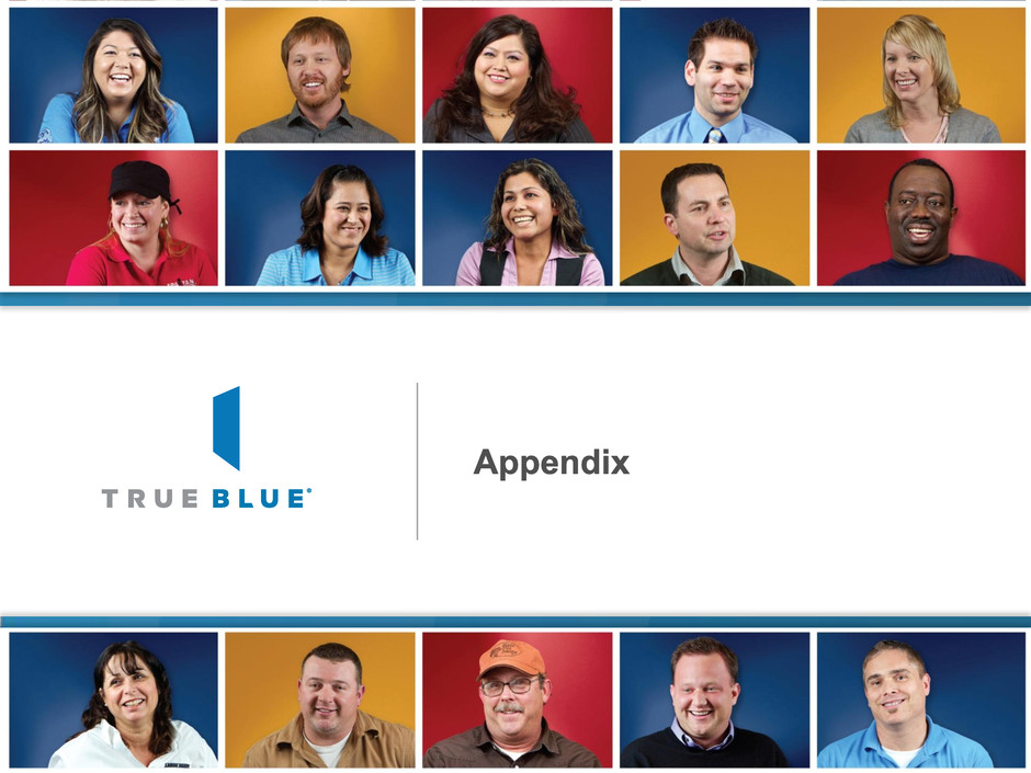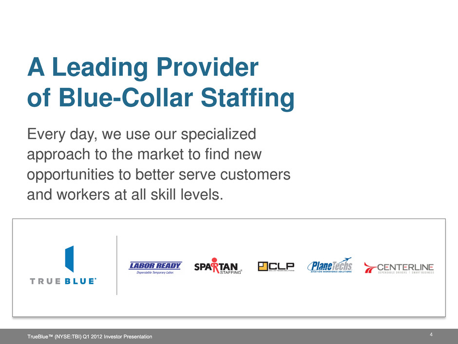 TrueBlue Investment Highlights 3 Successful vertical industry approach Compelling growth potential for staffing industry Unique industry-related growth drivers for TrueBlue Multiple strategies to drive growth and efficiency Strong operating leverage Solid balance sheet