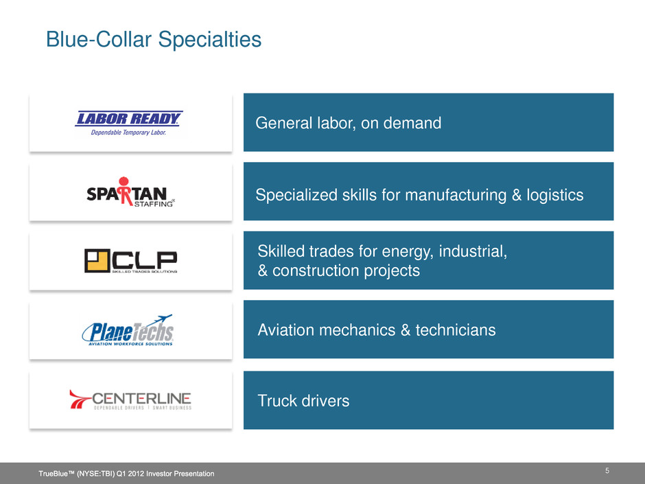 Every day, we use our specialized approach to the market to find new opportunities to better serve customers and workers at all skill levels. A Leading Provider of Blue-Collar Staffing 4
