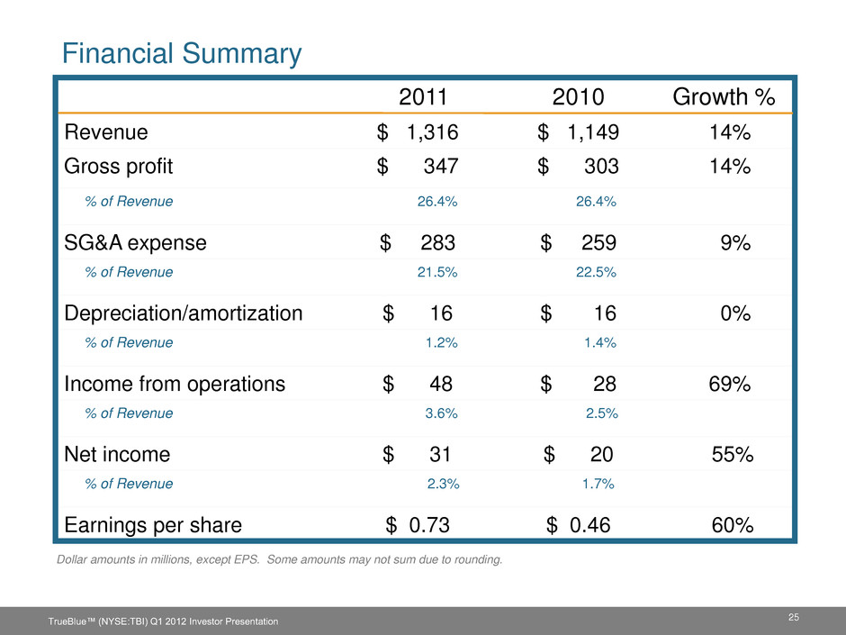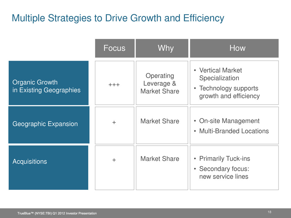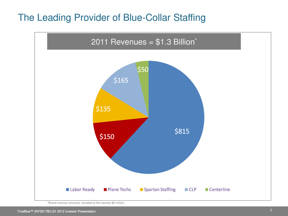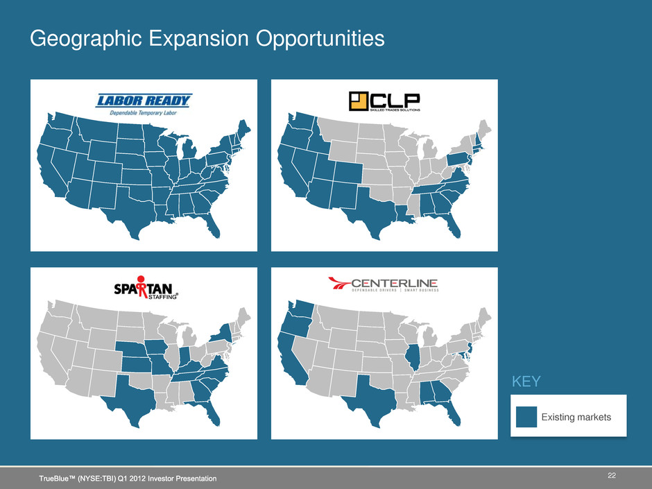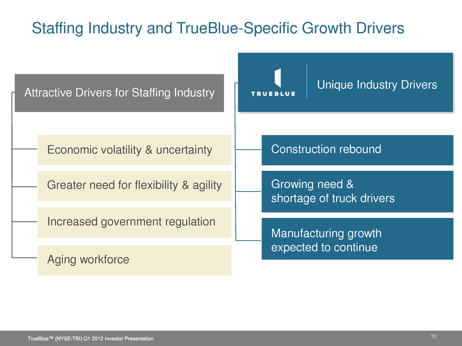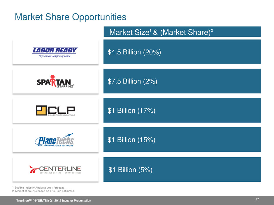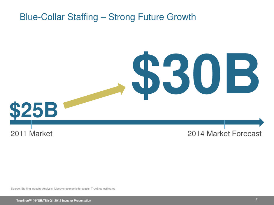 $4.5 Billion (20%) $7.5 Billion (2%) $1 Billion (17%) $1 Billion (15%) $1 Billion (5%) Market Share Opportunities 1 Staffing Industry Analysts 2011 forecast, 2 Market share (%) based on TrueBlue estimates Market Size1 & (Market Share)2 17