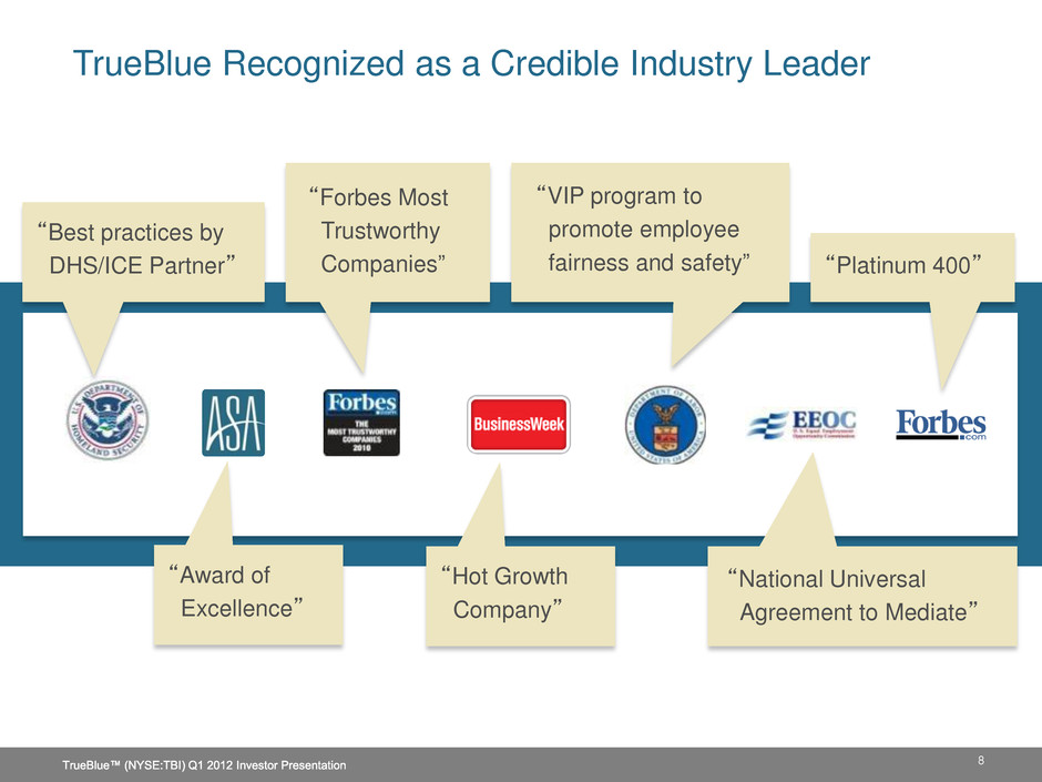 “Best practices by DHS/ICE Partner” “Forbes Most Trustworthy Companies” “VIP program to promote employee fairness and safety” “Platinum 400” “Award of Excellence” “Hot Growth Company” “National Universal Agreement to Mediate” 8 TrueBlue Recognized as a Credible Industry Leader