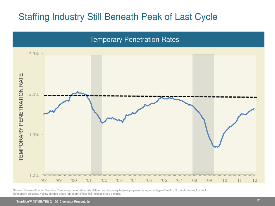 $25B 2014 Market Forecast $30B Source: Staffing Industry Analysts, Moody’s economic forecasts, TrueBlue estimates 2011 Market Blue-Collar Staffing – Strong Future Growth 11