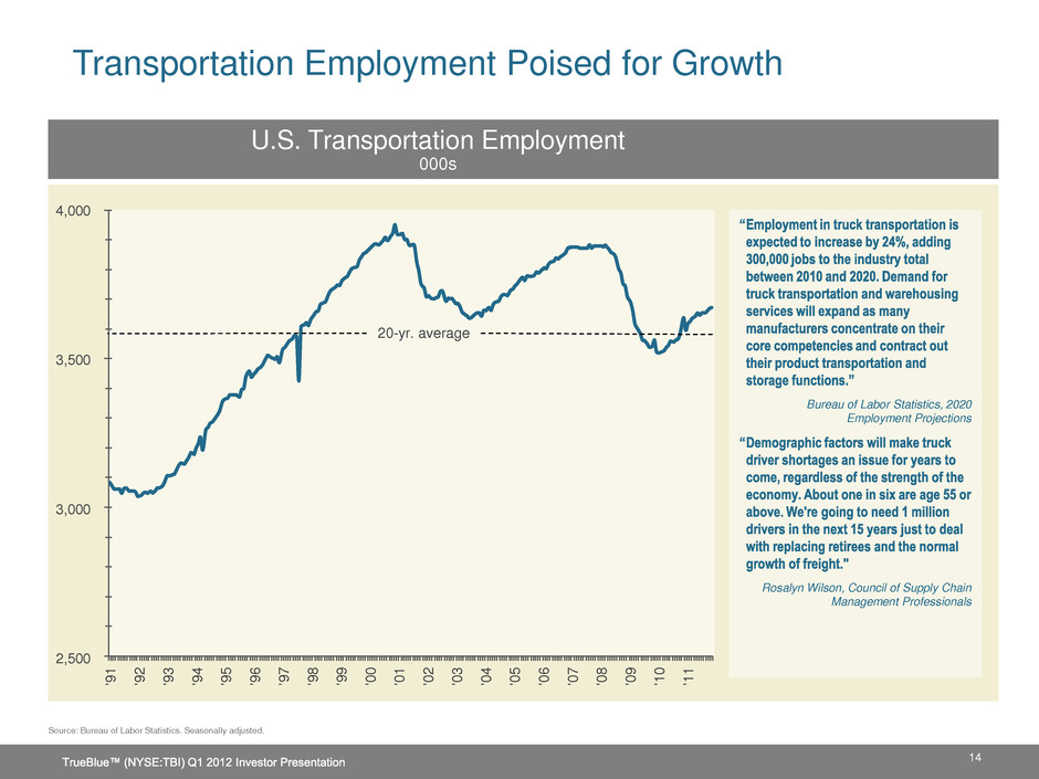 Construction Poised to Rebound Construction Employment As a percentage of total non-farm employment 13 5.1% Historical Average (1950 – 2010) “Construction is projected to be the fastest growing goods-producing industry over the next decade, representing 1.8 million new jobs by 2020.” Bureau of Labor Statistics, 2020 Employment Projections A construction rebound should provide additional revenue growth and higher gross margin for TrueBlue.* Chart Source: Bureau of Labor Statistics. Seasonally adjusted. * Based on company’s historical experience