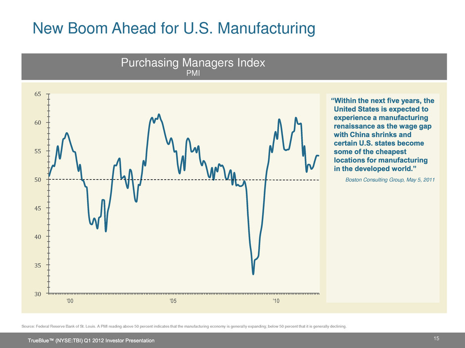 Boston Consulting Group, May 5, 2011 New Boom Ahead for U.S. Manufacturing Purchasing Managers Index PMI Source: Federal Reserve Bank of St. Louis. A PMI reading above 50 percent indicates that the manufacturing economy is general ly expanding; below 50 percent that it is generally declining. 15 30 35 40 45 50 55 60 65 '00 '05 '10