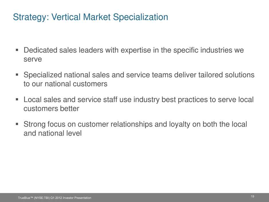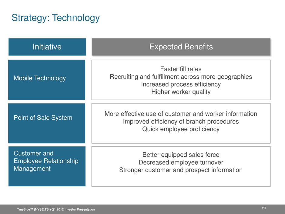 19 Strategy: Vertical Market Specialization Dedicated sales leaders with expertise in the specific industries we serve Specialized national sales and service teams deliver tailored solutions to our national customers Local sales and service staff use industry best practices to serve local customers better Strong focus on customer relationships and loyalty on both the local and national level TrueBlue™ (NYSE:TBI) Q1 2012 Investor Presentation