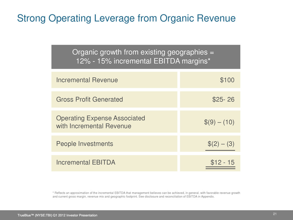 20 Strategy: Technology Mobile Technology Point of Sale System Customer and Employee Relationship Management Faster fill rates Recruiting and fulfillment across more geographies Increased process efficiency Higher worker quality More effective use of customer and worker information Improved efficiency of branch procedures Quick employee proficiency Better equipped sales force Decreased employee turnover Stronger customer and prospect information Initiative Expected Benefits