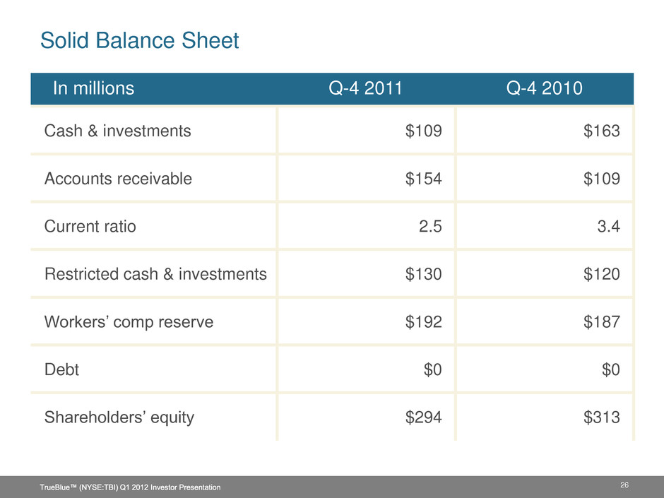 25 Financial Summary 2011 2010 Growth % Revenue $ 1,316 $ 1,149 14% Gross profit $ 347 $ 303 14% % of Revenue 26.4% 26.4% SG&A expense $ 283 $ 259 9% % of Revenue 21.5% 22.5% Depreciation/amortization $ 16 $ 16 0% % of Revenue 1.2% 1.4% Income from operations $ 48 $ 28 69% % of Revenue 3.6% 2.5% Net income $ 31 $ 20 55% % of Revenue 2.3% 1.7% Earnings per share $ 0.73 $ 0.46 60% Dollar amounts in millions, except EPS. Some amounts may not sum due to rounding. TrueBlue™ (NYSE:TBI) Q1 2012 Investor Presentation
