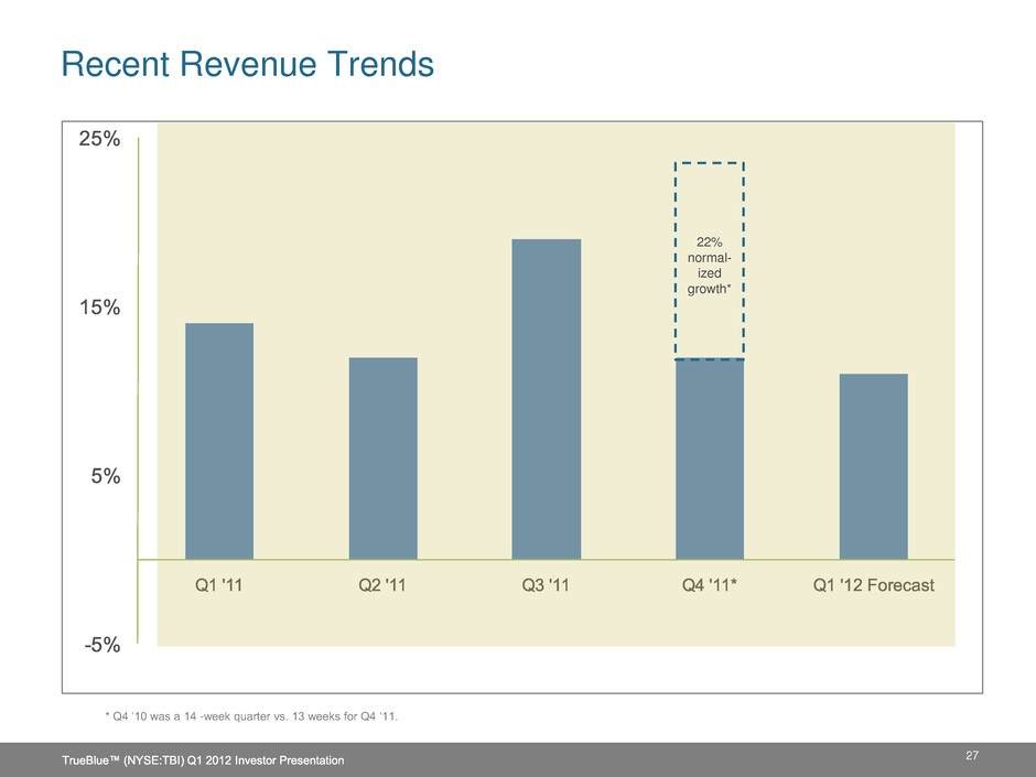 Recent Revenue Trends 27 * Q4 ’10 was a 14 -week quarter vs. 13 weeks for Q4 ‘11. 22% normal- ized growth*