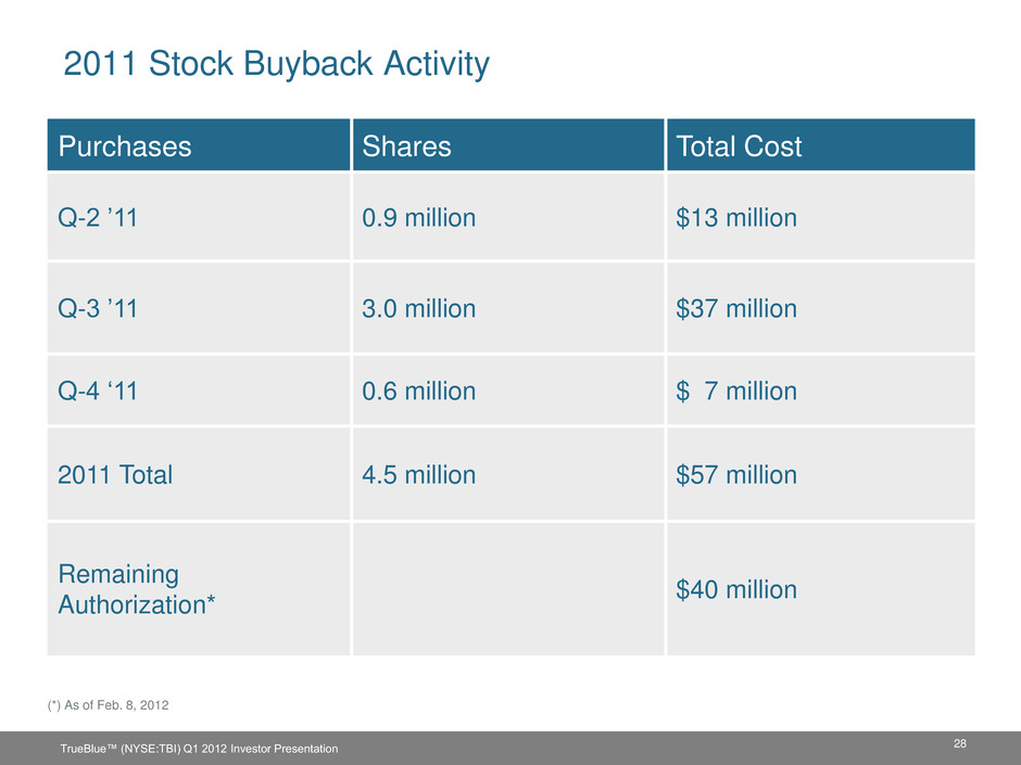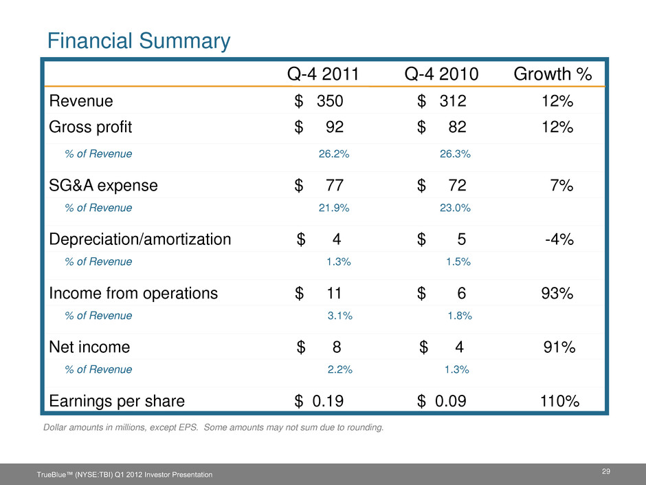 2011 Stock Buyback Activity Purchases Shares Total Cost Q-2 ’11 0.9 million $13 million Q-3 ’11 3.0 million $37 million Q-4 ‘11 0.6 million $ 7 million 2011 Total 4.5 million $57 million Remaining Authorization* $40 million (*) As of Feb. 8, 2012 28 TrueBlue™ (NYSE:TBI) Q1 2012 Investor Presentation