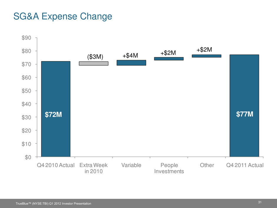 30 Gross Margin Change 22% 24% 26% 28% Q4 2010 Actual 2010 HIRE Act Credits / 2011 Sales Mix Pricing Q4 2011 Actual 26.3% 26.2% +0.3%-0.4% TrueBlue™ (NYSE:TBI) Q1 2012 Investor Presentation