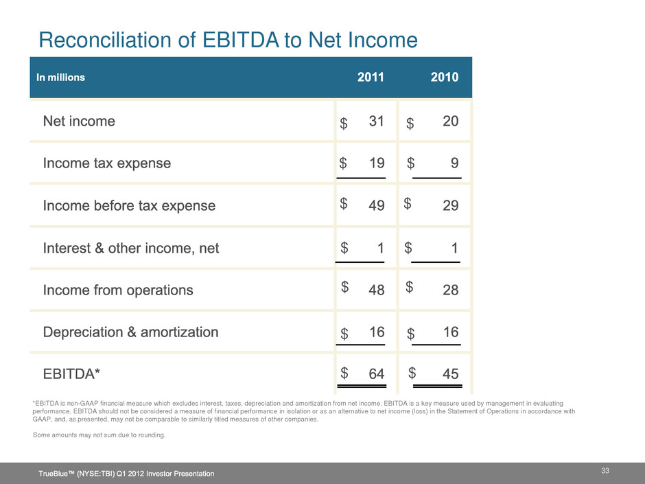 SG&A Expense Change $0 $10 $20 $30 $40 $50 $60 $70 $80 $90 Q4 2010 Actual Extra Week in 2010 Variable People Investments Other Q4 2011 Actual +$4M $72M +$2M +$2M $77M ($3M) TrueBlue™ (NYSE:TBI) Q1 2012 Investor Presentation 31