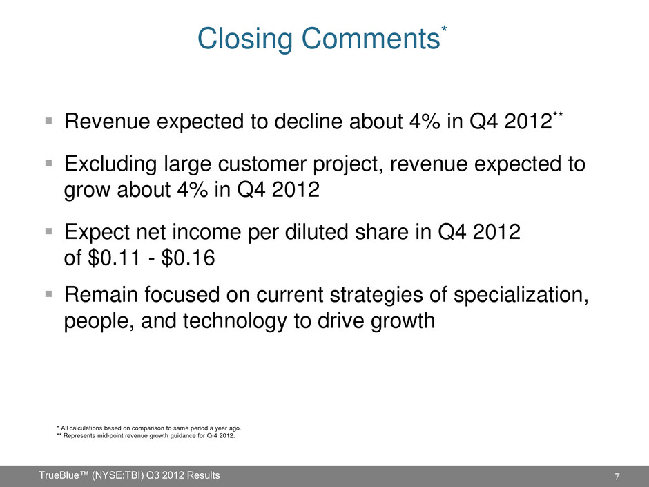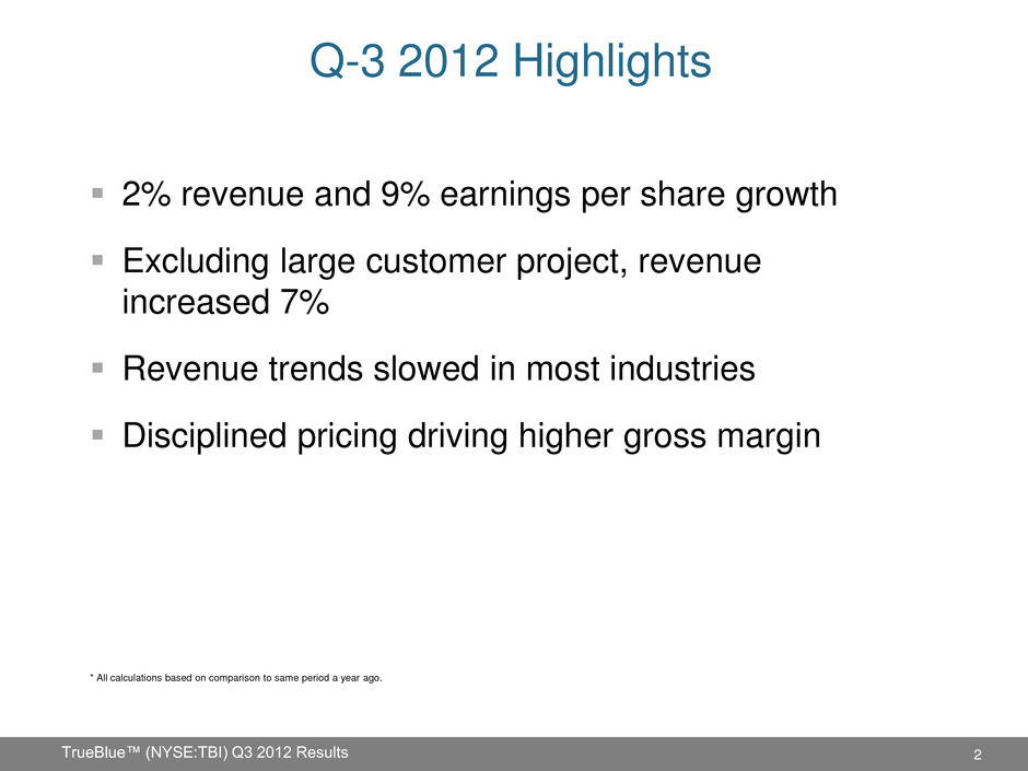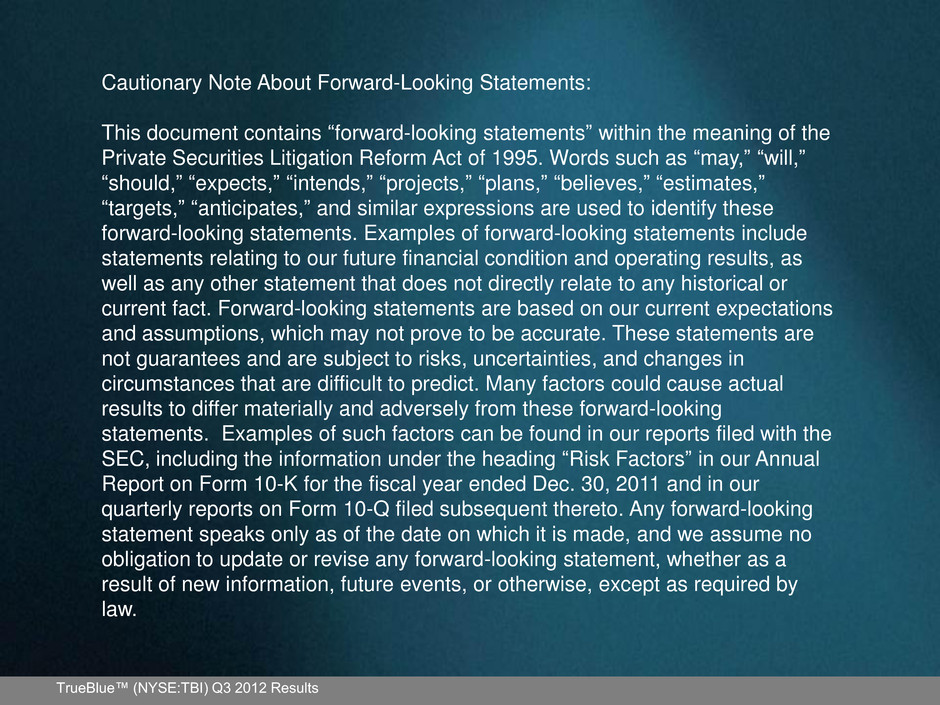 TrueBlue™ (NYSE:TBI) Q3 2012 Results Cautionary Note About Forward-Looking Statements: This document contains “forward-looking statements” within the meaning of the Private Securities Litigation Reform Act of 1995. Words such as “may,” “will,” “should,” “expects,” “intends,” “projects,” “plans,” “believes,” “estimates,” “targets,” “anticipates,” and similar expressions are used to identify these forward-looking statements. Examples of forward-looking statements include statements relating to our future financial condition and operating results, as well as any other statement that does not directly relate to any historical or current fact. Forward-looking statements are based on our current expectations and assumptions, which may not prove to be accurate. These statements are not guarantees and are subject to risks, uncertainties, and changes in circumstances that are difficult to predict. Many factors could cause actual results to differ materially and adversely from these forward-looking statements. Examples of such factors can be found in our reports filed with the SEC, including the information under the heading “Risk Factors” in our Annual Report on Form 10-K for the fiscal year ended Dec. 30, 2011 and in our quarterly reports on Form 10-Q filed subsequent thereto. Any forward-looking statement speaks only as of the date on which it is made, and we assume no obligation to update or revise any forward-looking statement, whether as a result of new information, future events, or otherwise, except as required by law.