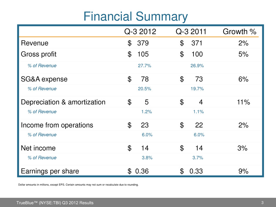 TrueBlue™ (NYSE:TBI) Q3 2012 Results 2 Q-3 2012 Highlights 2% revenue and 9% earnings per share growth Excluding large customer project, revenue increased 7% Revenue trends slowed in most industries Disciplined pricing driving higher gross margin * All calculations based on comparison to same period a year ago.