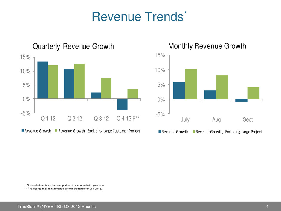 3 Financial Summary Q-3 2012 Q-3 2011 Growth % Revenue $ 379 $ 371 2% Gross profit $ 105 $ 100 5% % of Revenue 27.7% 26.9% SG&A expense $ 78 $ 73 6% % of Revenue 20.5% 19.7% Depreciation & amortization $ 5 $ 4 11% % of Revenue 1.2% 1.1% Income from operations $ 23 $ 22 2% % of Revenue 6.0% 6.0% Net income $ 14 $ 14 3% % of Revenue 3.8% 3.7% Earnings per share $ 0.36 $ 0.33 9% Dollar amounts in millions, except EPS. Certain amounts may not sum or recalculate due to rounding. TrueBlue™ (NYSE:TBI) Q3 2012 Results