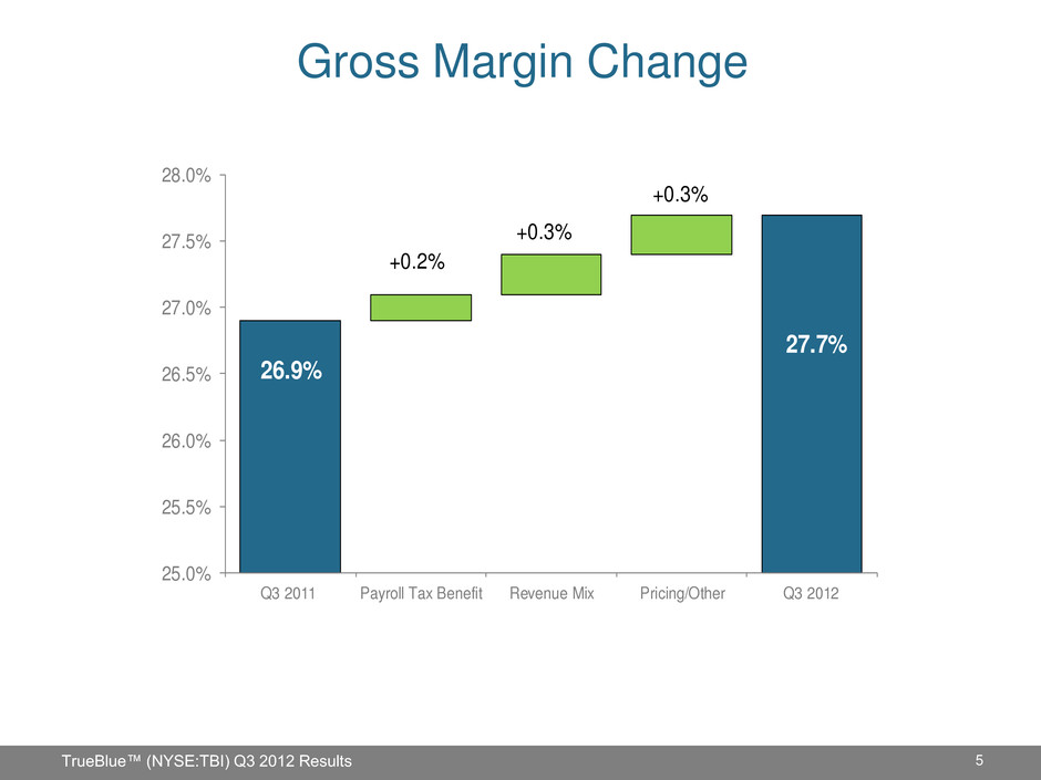 Revenue Trends* -5% 0% 5% 10% 15% Q-1 12 Q-2 12 Q-3 12 Q-4 12 F** Quarterly Revenue Growth Revenue Growth Revenue Growth, Excluding Large Customer Project 4 TrueBlue™ (NYSE:TBI) Q3 2012 Results * All calculations based on comparison to same period a year ago. ** Represents mid-point revenue growth guidance for Q-4 2012. -5% 0% 5% 10% 15% July Aug Sept Monthly Revenue Growth Revenue Growth Revenue Growth, Excluding Large Project