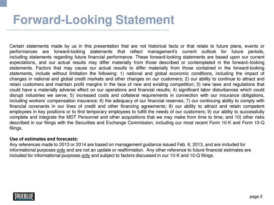Certain statements made by us in this presentation that are not historical facts or that relate to future plans, events or performances are forward-looking statements that reflect management’s current outlook for future periods, including statements regarding future financial performance. These forward-looking statements are based upon our current expectations, and our actual results may differ materially from those described or contemplated in the forward–looking statements. Factors that may cause our actual results to differ materially from those contained in the forward-looking statements, include without limitation the following: 1) national and global economic conditions, including the impact of changes in national and global credit markets and other changes on our customers; 2) our ability to continue to attract and retain customers and maintain profit margins in the face of new and existing competition; 3) new laws and regulations that could have a materially adverse effect on our operations and financial results; 4) significant labor disturbances which could disrupt industries we serve; 5) increased costs and collateral requirements in connection with our insurance obligations, including workers’ compensation insurance; 6) the adequacy of our financial reserves; 7) our continuing ability to comply with financial covenants in our lines of credit and other financing agreements; 8) our ability to attract and retain competent employees in key positions or to find temporary employees to fulfill the needs of our customers; 9) our ability to successfully complete and integrate the MDT Personnel and other acquisitions that we may make from time to time; and 10) other risks described in our filings with the Securities and Exchange Commission, including our most recent Form 10-K and Form 10-Q filings. Use of estimates and forecasts: Any references made to 2013 or 2014 are based on management guidance issued Feb. 6, 2013, and are included for informational purposes only and are not an update or reaffirmation. Any other reference to future financial estimates are included for informational purposes only and subject to factors discussed in our 10-K and 10-Q filings. Forward-Looking Statement page 2