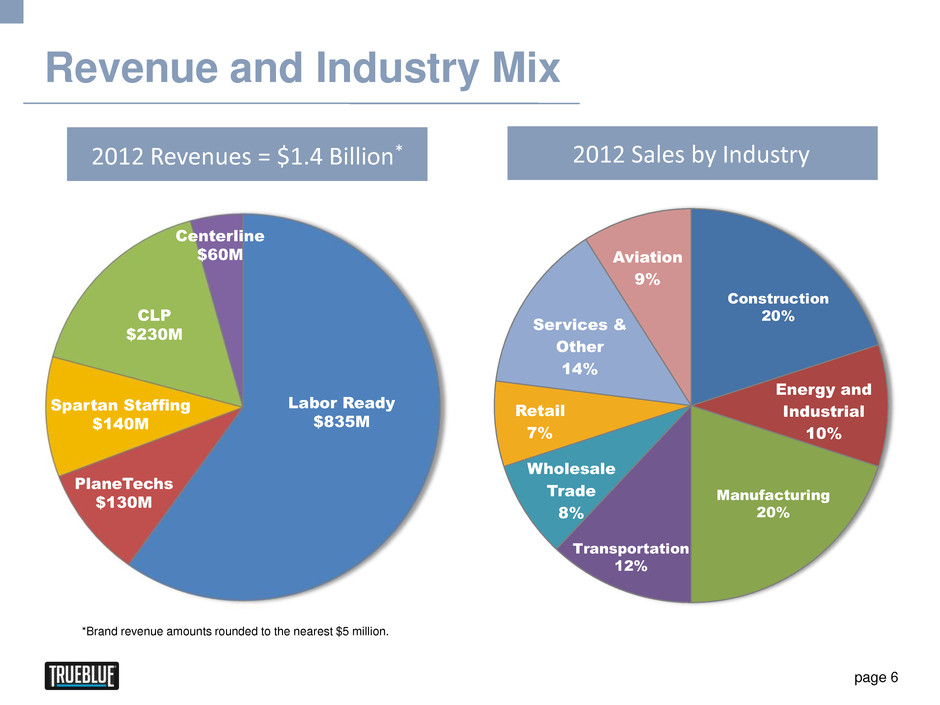 Revenue and Industry Mix *Brand revenue amounts rounded to the nearest $5 million. page 6 2012 Sales by Industry Energy and Industrial 10% Wholesale Trade 8% Retail 7% Services & Other 14% Aviation 9% Construction 20% Transportation 12% Manufacturing 20% Labor Ready $835M Centerline $60M CLP $230M Spartan Staffing $140M PlaneTechs $130M 2012 Revenues = $1.4 Billion*