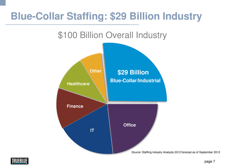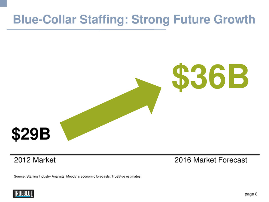 Blue-Collar Staffing: $29 Billion Industry $25 Billion Industrial/ Blue-Collar Other Finance Healthcare Office IT Blue-Collar/Industrial Source: Staffing Industry Analysts 2012 forecast as of September 2012 $29 Billion $100 Billion Overall Industry page 7