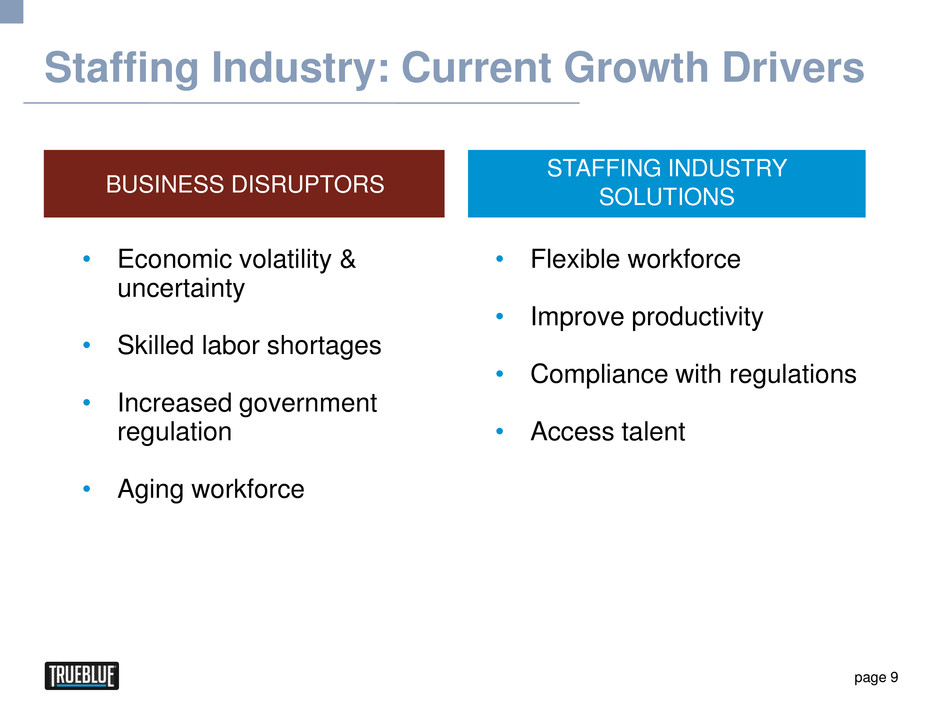 Blue-Collar Staffing: Strong Future Growth 2016 Market Forecast 2012 Market page 8 $36B $29B Source: Staffing Industry Analysts, Moody’s economic forecasts, TrueBlue estimates