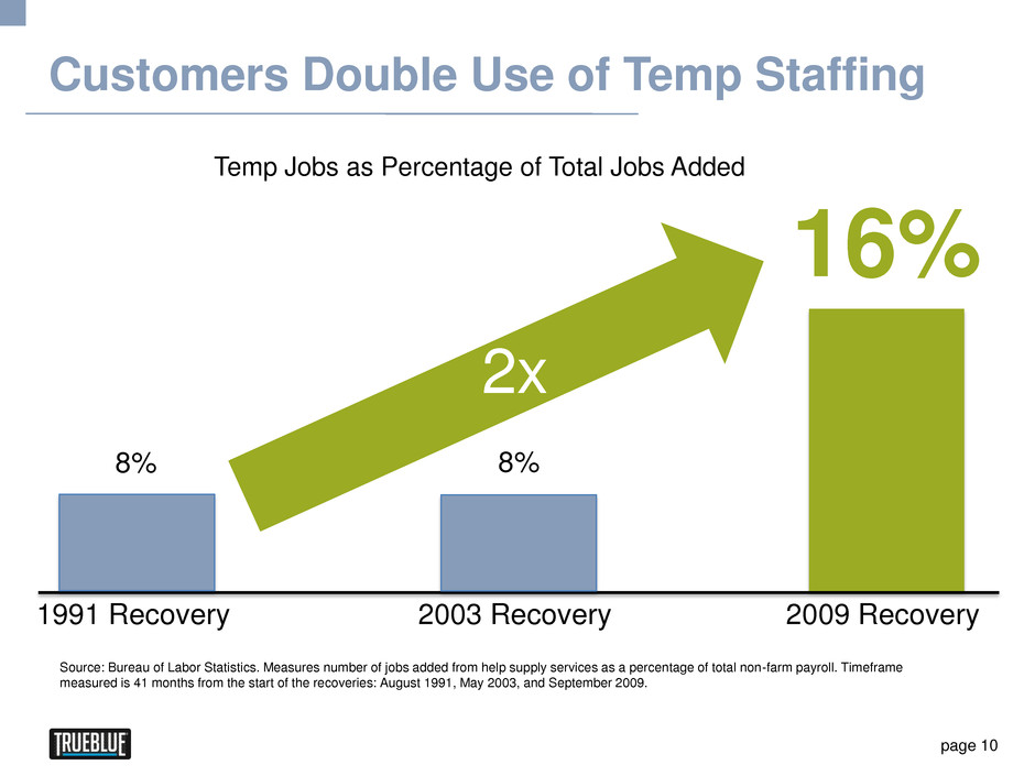 Customers Double Use of Temp Staffing 2009 Recovery 1991 Recovery 2003 Recovery 2x Temp Jobs as Percentage of Total Jobs Added page 10 16% 8% 8% Source: Bureau of Labor Statistics. Measures number of jobs added from help supply services as a percentage of total non-farm payroll. Timeframe measured is 41 months from the start of the recoveries: August 1991, May 2003, and September 2009.