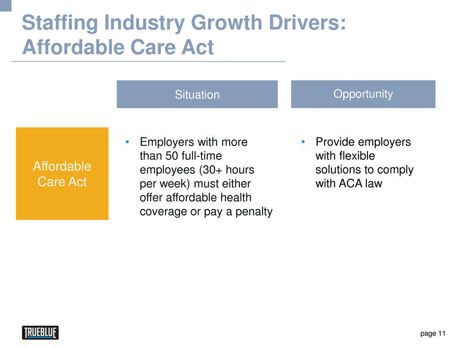 Staffing Industry Growth Drivers: Affordable Care Act Focus How Affordable Care Act • Employers with more than 50 full-time employees (30+ hours per week) must either offer affordable health coverage or pay a penalty • Provide employers with flexible solutions to comply with ACA law page 11 Opportunity Situation Opportunity i