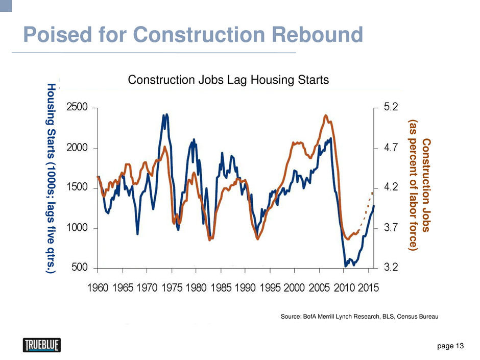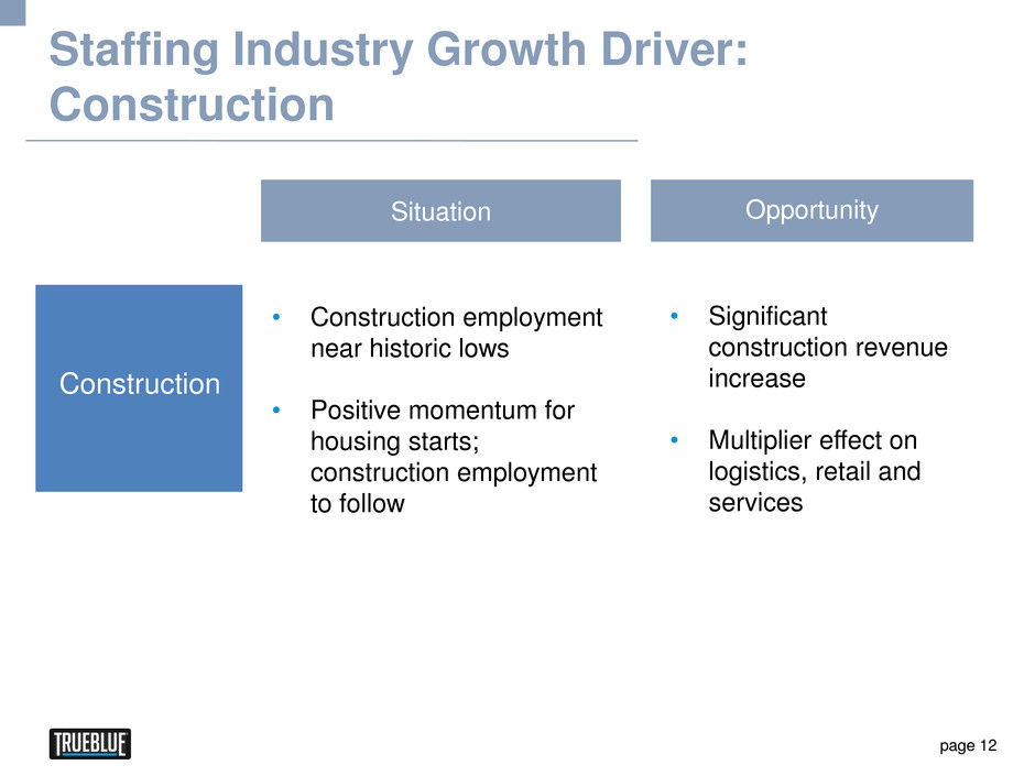 Staffing Industry Growth Driver: Construction Focus How Situation Opportunity Construction • Construction employment near historic lows • Positive momentum for housing starts; construction employment to follow page 12 • Significant construction revenue increase • Multiplier effect on logistics, retail and services i