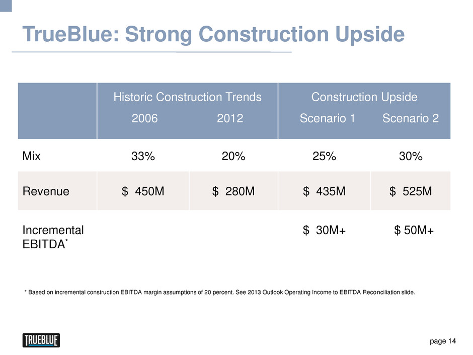 TrueBlue: Strong Construction Upside page 14 Historic Construction Trends 2006 2012 Construction Upside Scenario 1 Scenario 2 Mix 33% 20% 25% 30% Revenue $ 450M $ 280M $ 435M $ 525M Incremental EBITDA* $ 30M+ $ 50M+ * Based on incremental construction EBITDA margin assumptions of 20 percent. See 2013 Outlook Operating Income to EBITDA Reconciliation slide.