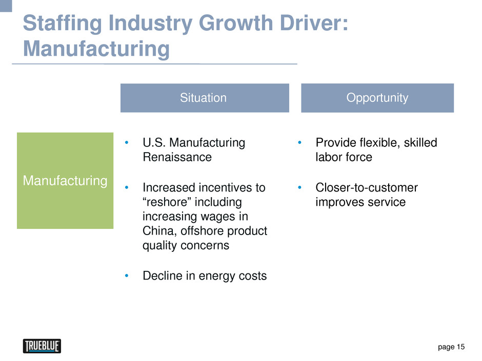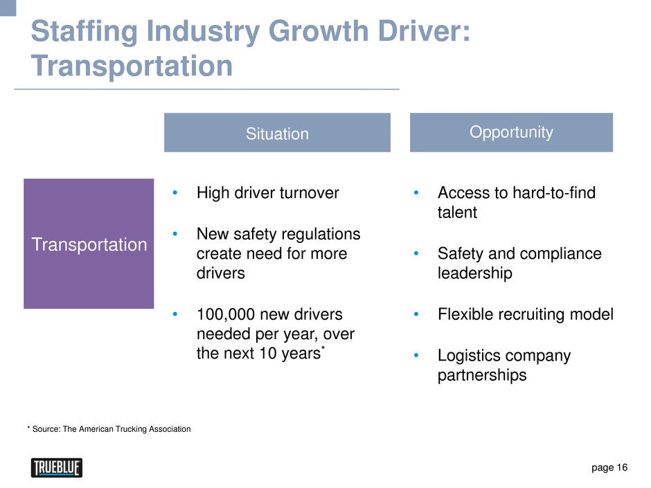 Staffing Industry Growth Driver: Manufacturing Focus How Situation Opportunity Manufacturing • U.S. Manufacturing Renaissance • Increased incentives to “reshore” including increasing wages in China, offshore product quality concerns • Decline in energy costs • Provide flexible, skilled labor force • Closer-to-customer improves service page 15 Opportunity