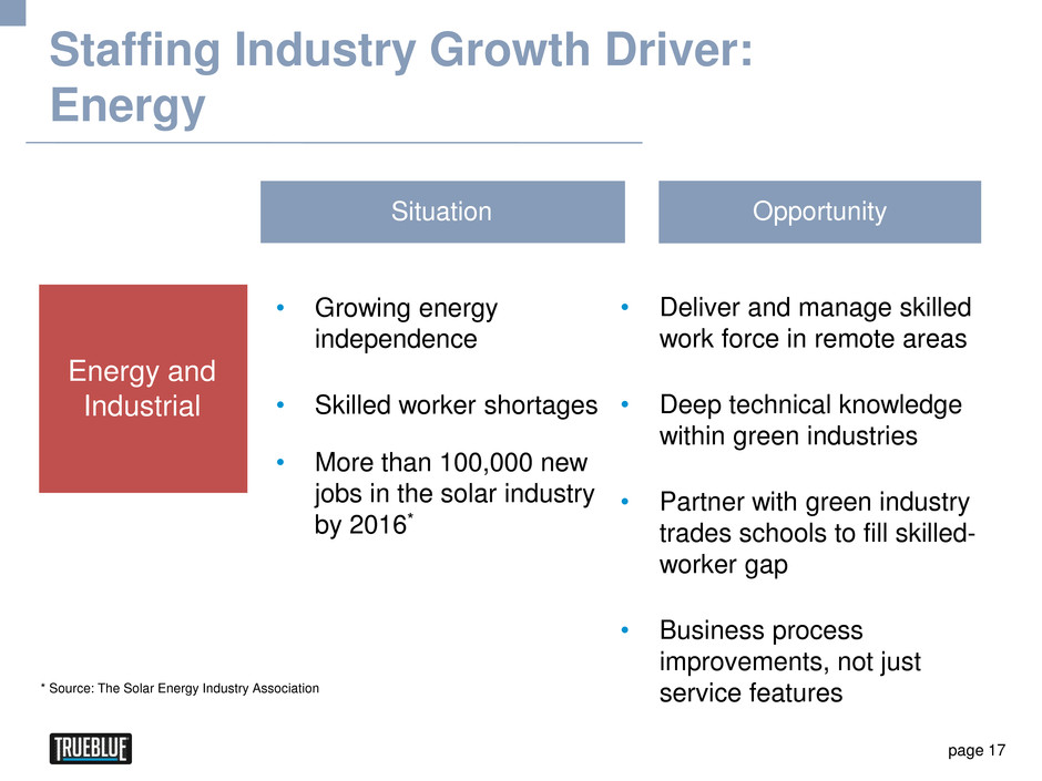 Staffing Industry Growth Driver: Energy Focus How • Growing energy independence • Skilled worker shortages • More than 100,000 new jobs in the solar industry by 2016* • Deliver and manage skilled work force in remote areas • Deep technical knowledge within green industries • Partner with green industry trades schools to fill skilled- worker gap • Business process improvements, not just service features Energy and Industrial Situation page 17 * Source: The Solar Energy Industry Association Opportunity