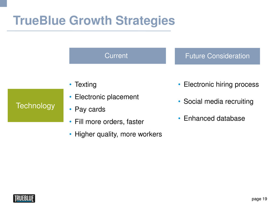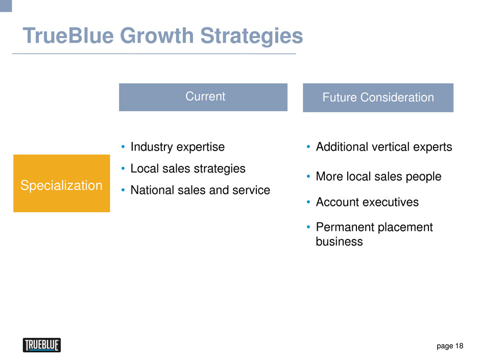 TrueBlue Growth Strategies Focus How page 18 Specialization • Industry expertise • Local sales strategies • National sales and service Specialization Current • Additional vertical experts • More local sales people • Account executives • Permanent placement business Future Consideration