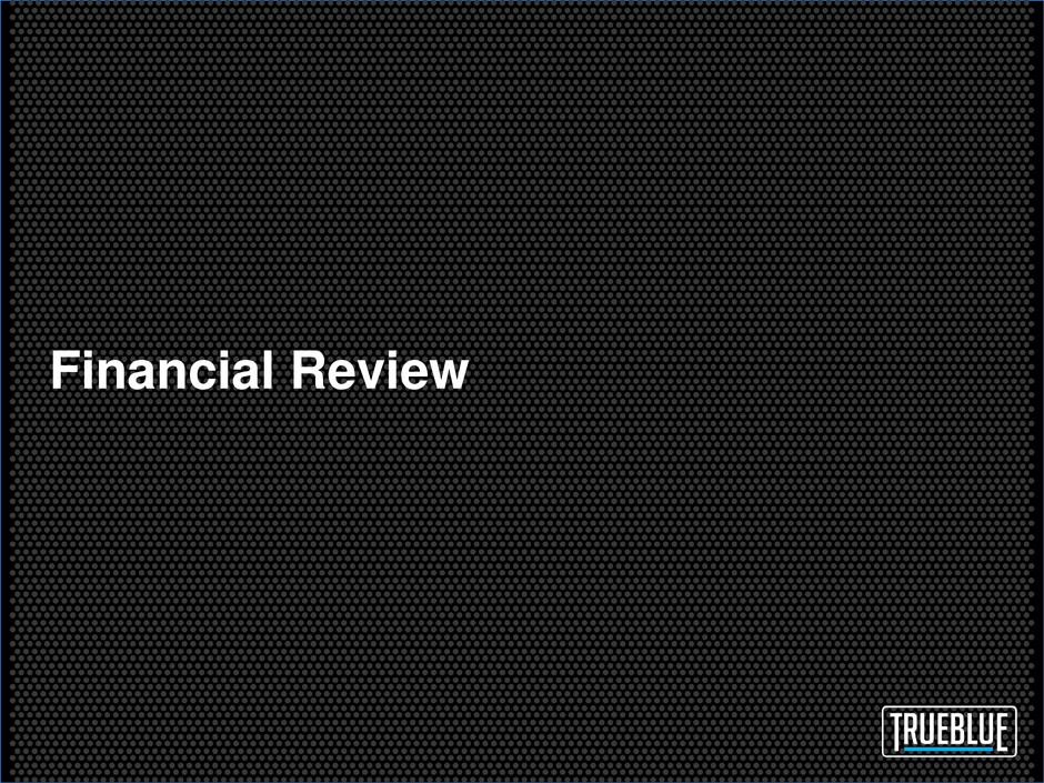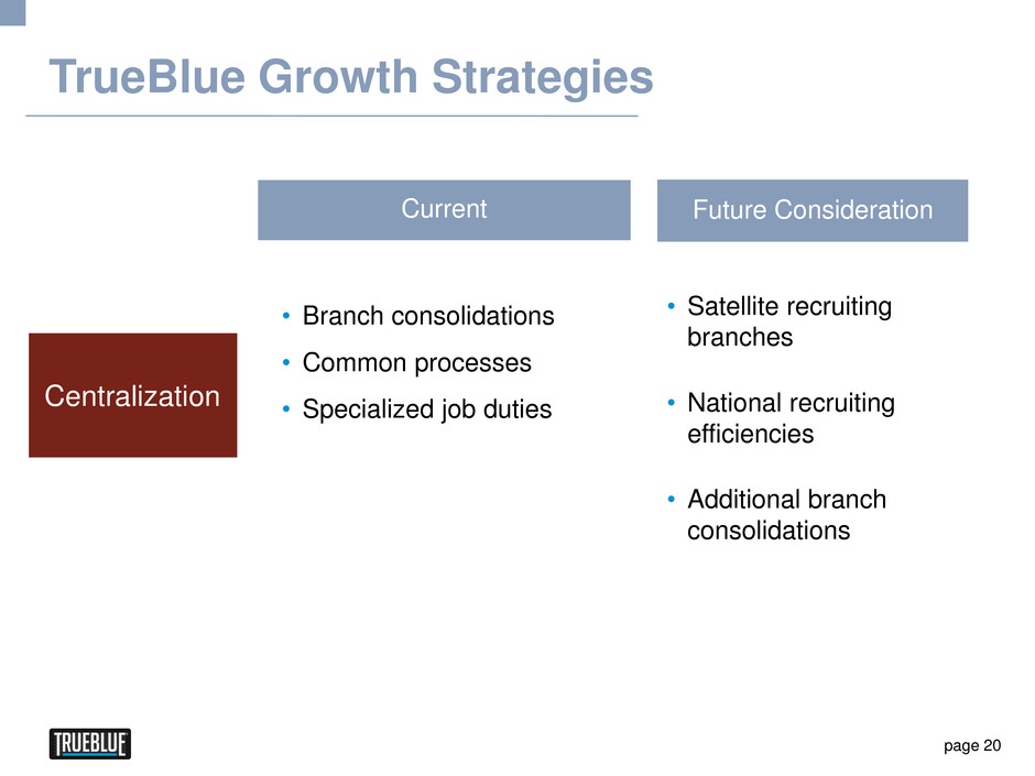 TrueBlue Growth Strategies Focus How Technology • Texting • Electronic placement • Pay cards • Fill more orders, faster • Higher quality, more workers page 19 Technology Current Opportunity • Electronic hiring process • Social media recruiting • Enhanced database Future Consideration