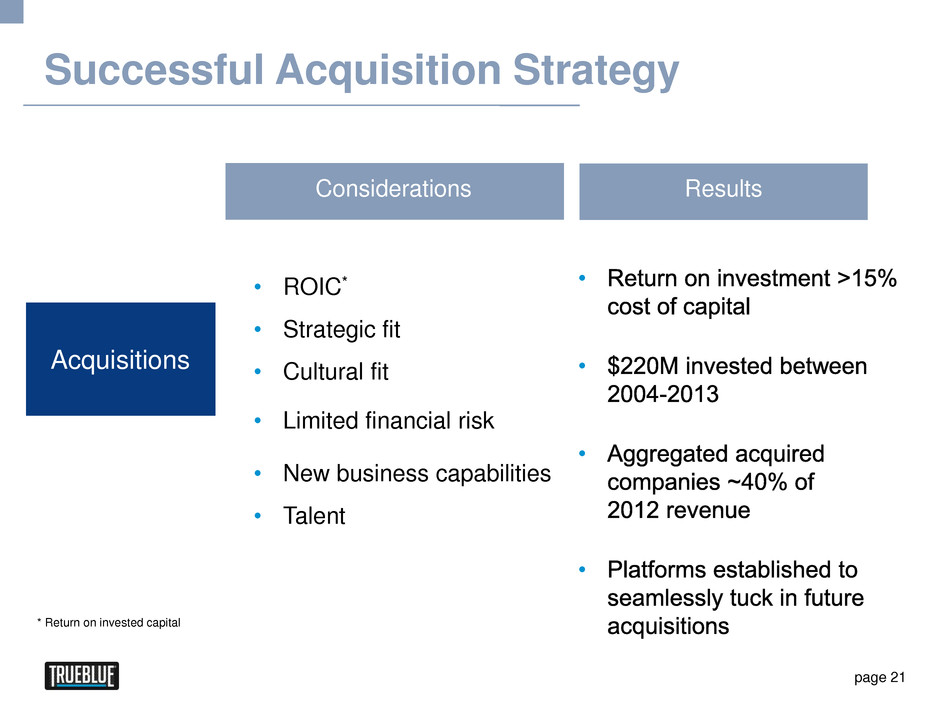 TrueBlue Growth Strategies Focus How Why How Technology page 20 Centralization • Branch consolidations • Common processes • Specialized job duties Centralization Current Opportunity • Satellite recruiting branches • National recruiting efficiencies • Additional branch consolidations Future Consideration