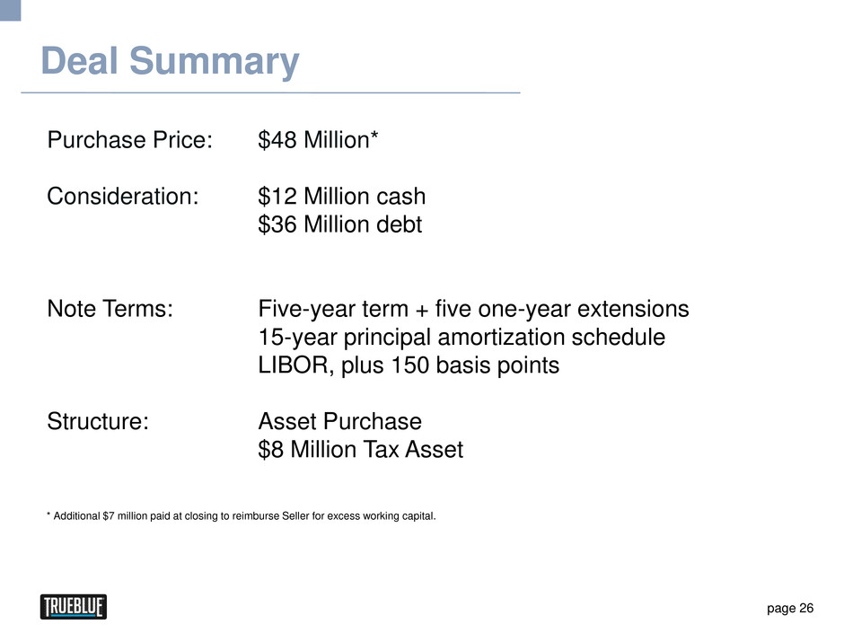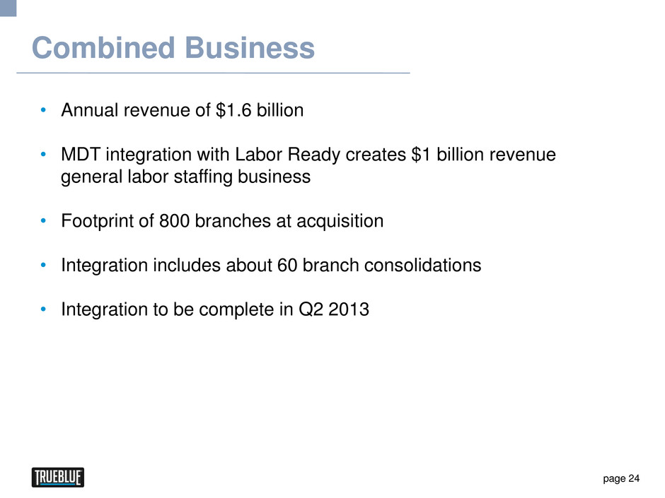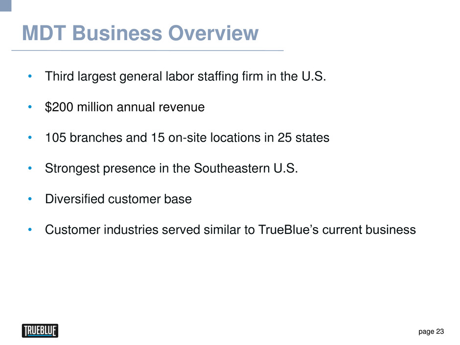 MDT Business Overview • Third largest general labor staffing firm in the U.S. • $200 million annual revenue • 105 branches and 15 on-site locations in 25 states • Strongest presence in the Southeastern U.S. • Diversified customer base • Customer industries served similar to TrueBlue’s current business page 23