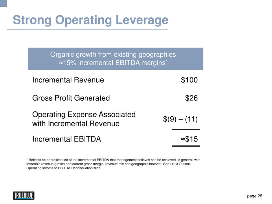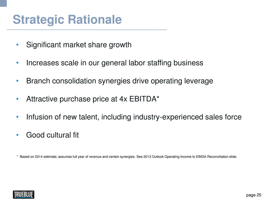 Strategic Rationale • Significant market share growth • Increases scale in our general labor staffing business • Branch consolidation synergies drive operating leverage • Attractive purchase price at 4x EBITDA* • Infusion of new talent, including industry-experienced sales force • Good cultural fit * Based on 2014 estimate; assumes full year of revenue and certain synergies. See 2013 Outlook Operating Income to EBIDA Reconciliation slide. page 25