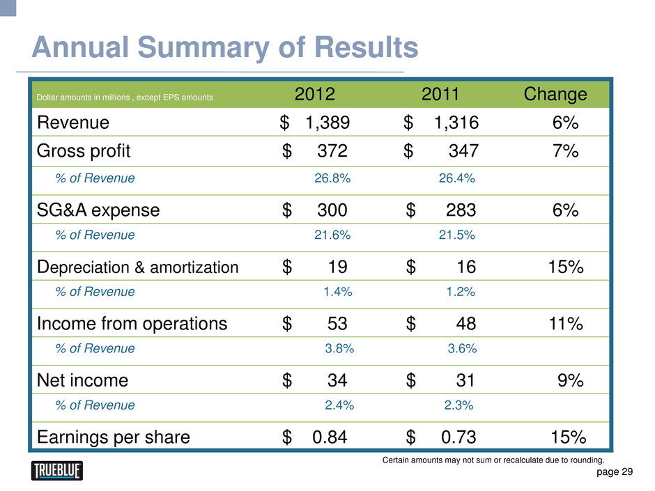 Annual Summary of Results Dollar amounts in millions , except EPS amounts 2012 2011 Change Revenue $ 1,389 $ 1,316 6% Gross profit $ 372 $ 347 7% % of Revenue 26.8% 26.4% SG&A expense $ 300 $ 283 6% % of Revenue 21.6% 21.5% Depreciation & amortization $ 19 $ 16 15% % of Revenue 1.4% 1.2% Income from operations $ 53 $ 48 11% % of Revenue 3.8% 3.6% Net income $ 34 $ 31 9% % of Revenue 2.4% 2.3% Earnings per share $ 0.84 $ 0.73 15% Certain amounts may not sum or recalculate due to rounding. page 29