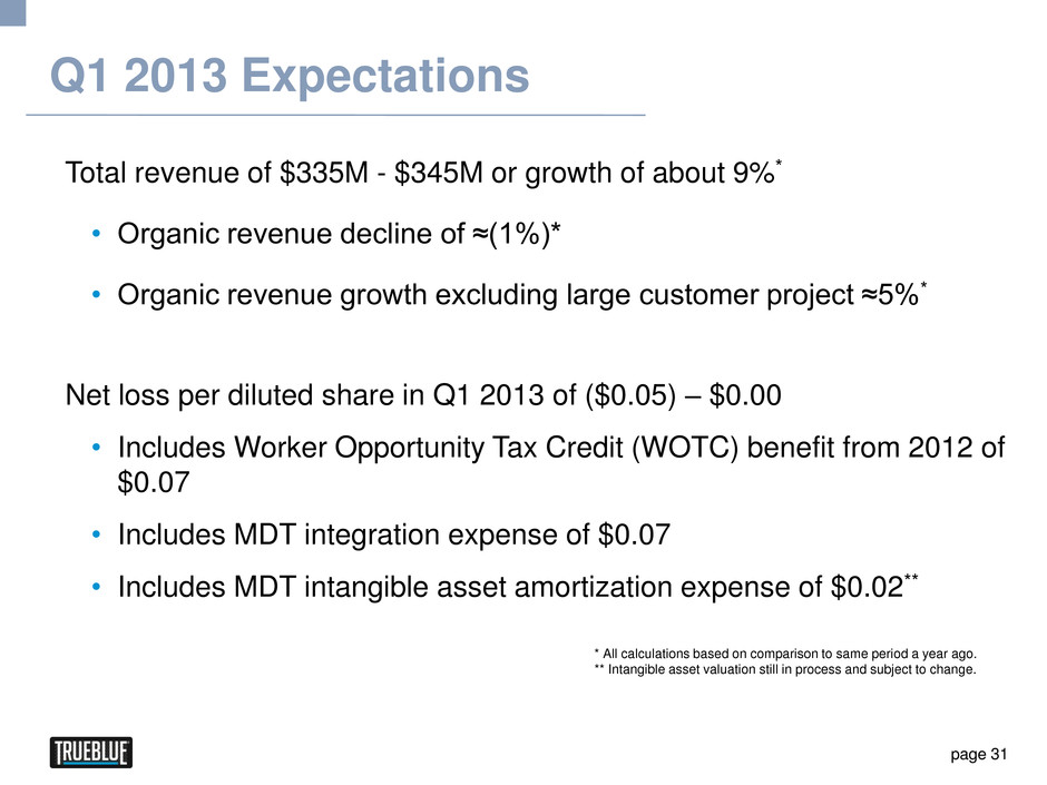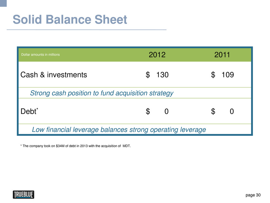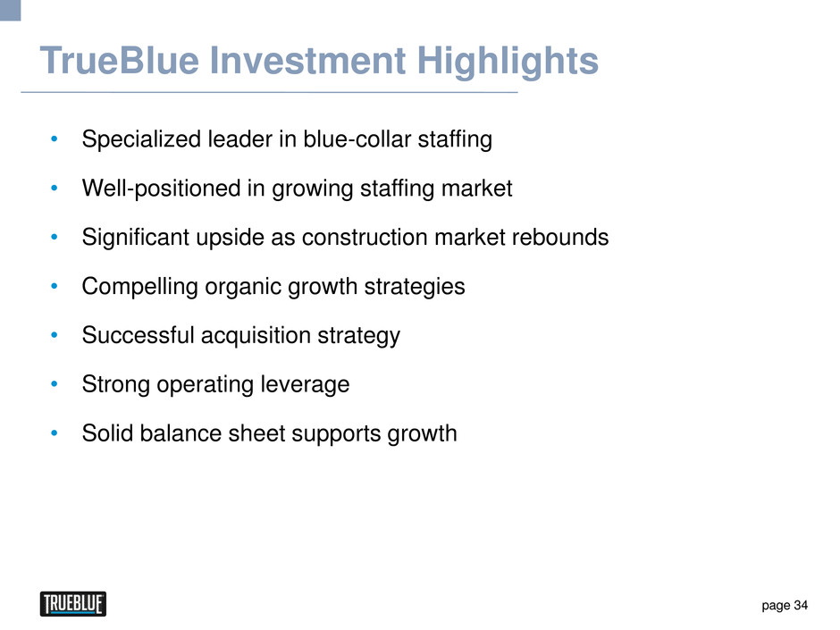 2013 Outlook Operating Income to EBITDA Reconciliation *Adjusted EBITDA excludes one-time integration costs related to the MDT acquisition and one-time reorganization costs related to branch efficiencies from EBITDA. EBITDA and Adjusted EBITDA are key measures used by management in evaluating performance. EBITDA and Adjusted EBITDA should not be considered a measure of financial performance in isolation or as an alternative to operating income (loss) in the Statement of Operations in accordance with GAAP, and, as presented, may not be comparable to similarly titled measures of other companies. page 33 Core Business Large Customer Headwind MDT Acquisition Branch Efficiencies TrueBlue Total Income (loss) from operations 57 $ (10) $ (4) $ 8 $ 51 $ Depreciation & amortization 20 - 6 - 26 EBITDA* 77 (10) 2 8 77 Integration / other - - 6 2 8 Adjusted EBITDA* 77 $ (10) $ 8 $ 10 $ 85 $