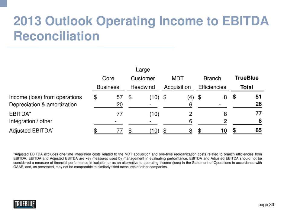 2013 Full-Year Outlook * Represents the expected year over year reduction in project work in 2013 for our top aviation-related customer. ** Centralization of common operating processes and deployment of mobile technology offerings. *** Integration costs related to the MDT acquisition and one-time reorganization costs related to branch efficiencies. ****See 2013 Outlook Operating Income to EBITDA Reconciliation slide. page 32 Core Business Large Customer Headwind* MDT Acquisition Branch Efficiencies** TrueBlue Total Revenue 1,465 $ (50) $ 185 $ 20 $ 1,620 $ Total Revenue Growth 5% -4% 13% 1% 17% Gross Profit 388 (10) 37 5 420 Gross Margin % 26% 20% 20% 25% 26% SG&A 311 - 35 (3) 343 EBITDA**** 77 (10) 2 8 77 Integration / Other *** - - 6 2 8 Adjusted EBITDA**** 77 $ (10) $ 8 $ 10 $ 85 $