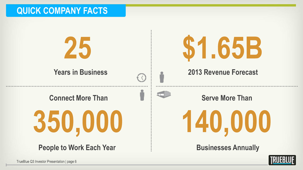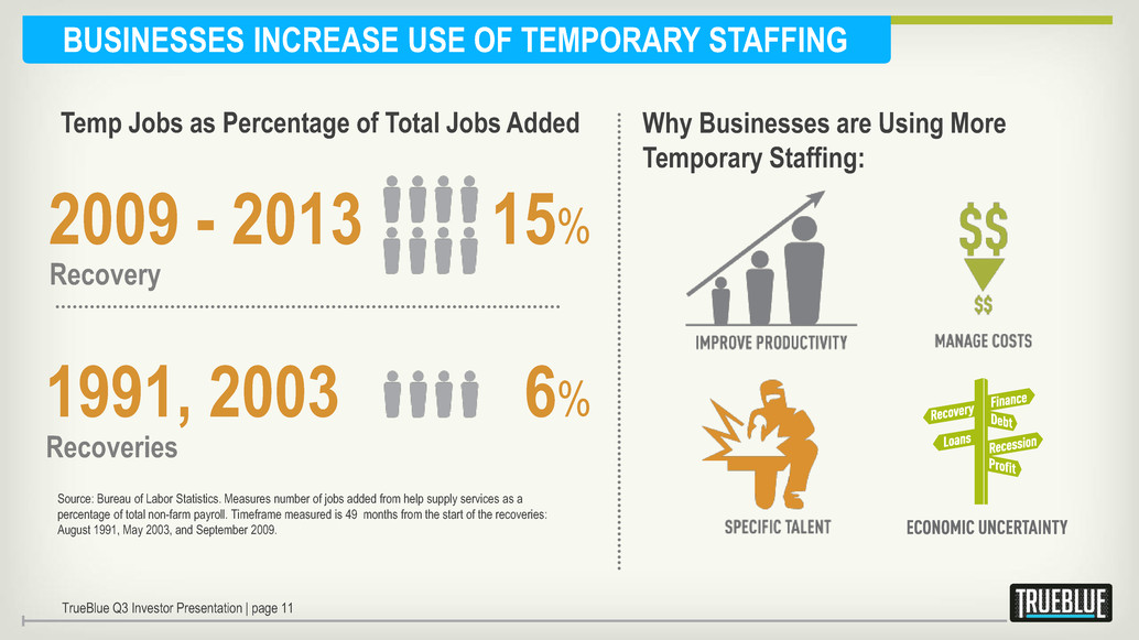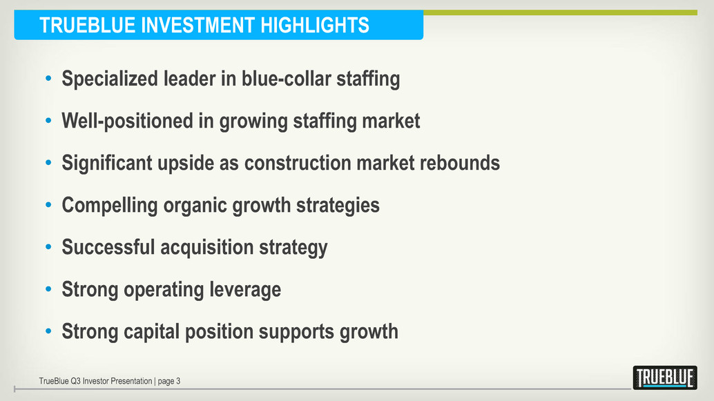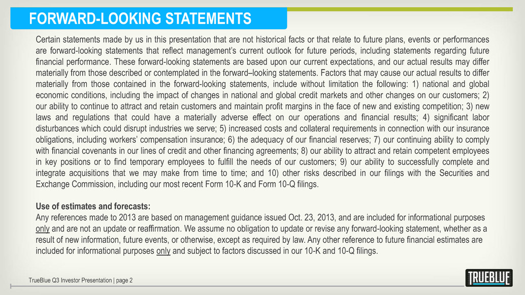 Certain statements made by us in this presentation that are not historical facts or that relate to future plans, events or performances are forward-looking statements that reflect management’s current outlook for future periods, including statements regarding future financial performance. These forward-looking statements are based upon our current expectations, and our actual results may differ materially from those described or contemplated in the forward–looking statements. Factors that may cause our actual results to differ materially from those contained in the forward-looking statements, include without limitation the following: 1) national and global economic conditions, including the impact of changes in national and global credit markets and other changes on our customers; 2) our ability to continue to attract and retain customers and maintain profit margins in the face of new and existing competition; 3) new laws and regulations that could have a materially adverse effect on our operations and financial results; 4) significant labor disturbances which could disrupt industries we serve; 5) increased costs and collateral requirements in connection with our insurance obligations, including workers’ compensation insurance; 6) the adequacy of our financial reserves; 7) our continuing ability to comply with financial covenants in our lines of credit and other financing agreements; 8) our ability to attract and retain competent employees in key positions or to find temporary employees to fulfill the needs of our customers; 9) our ability to successfully complete and integrate acquisitions that we may make from time to time; and 10) other risks described in our filings with the Securities and Exchange Commission, including our most recent Form 10-K and Form 10-Q filings. Use of estimates and forecasts: Any references made to 2013 are based on management guidance issued Oct. 23, 2013, and are included for informational purposes only and are not an update or reaffirmation. We assume no obligation to update or revise any forward-looking statement, whether as a result of new information, future events, or otherwise, except as required by law. Any other reference to future financial estimates are included for informational purposes only and subject to factors discussed in our 10-K and 10-Q filings. TrueBlue Q3 Investor Presentation | page 2 FORWARD-LOOKING STATEMENTS