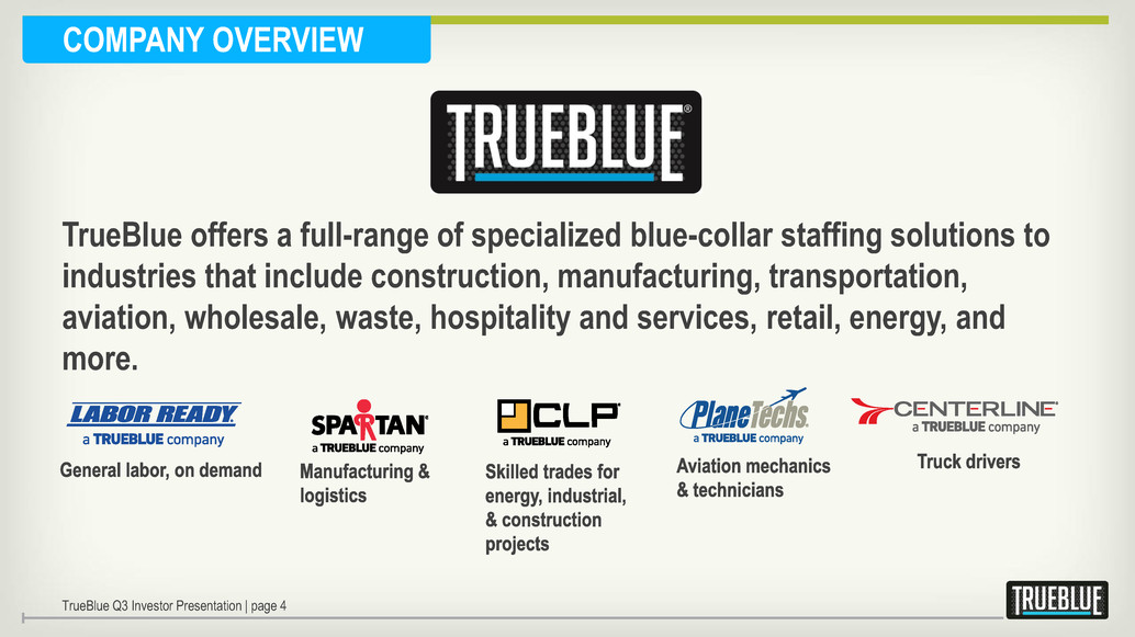 TRUEBLUE INVESTMENT HIGHLIGHTS • Specialized leader in blue-collar staffing • Well-positioned in growing staffing market • Significant upside as construction market rebounds • Compelling organic growth strategies • Successful acquisition strategy • Strong operating leverage • Strong capital position supports growth TrueBlue Q3 Investor Presentation | page 3