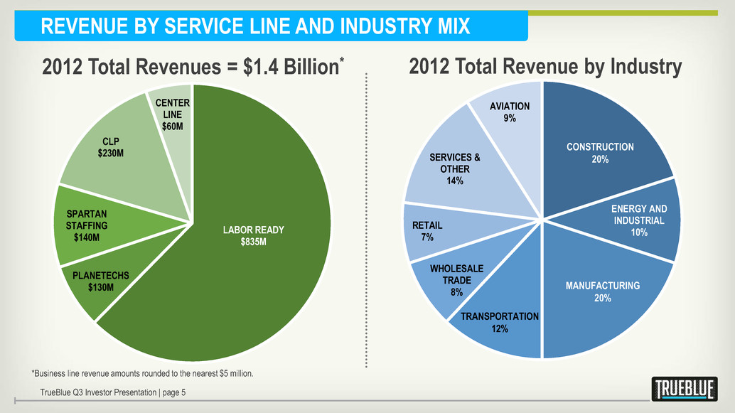 COMPANY OVERVIEW TrueBlue offers a full-range of specialized blue-collar staffing solutions to industries that include construction, manufacturing, transportation, aviation, wholesale, waste, hospitality and services, retail, energy, and more. TrueBlue Q3 Investor Presentation | page 4