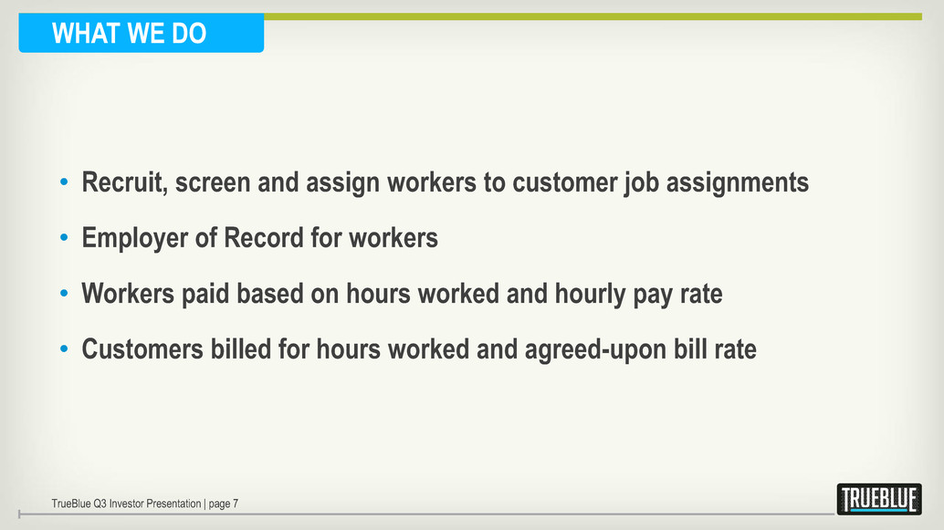 WHAT WE DO TrueBlue Q3 Investor Presentation | page 7 • Recruit, screen and assign workers to customer job assignments • Employer of Record for workers • Workers paid based on hours worked and hourly pay rate • Customers billed for hours worked and agreed-upon bill rate