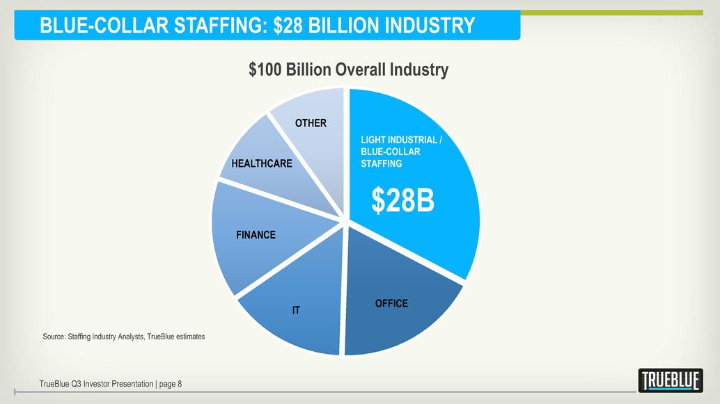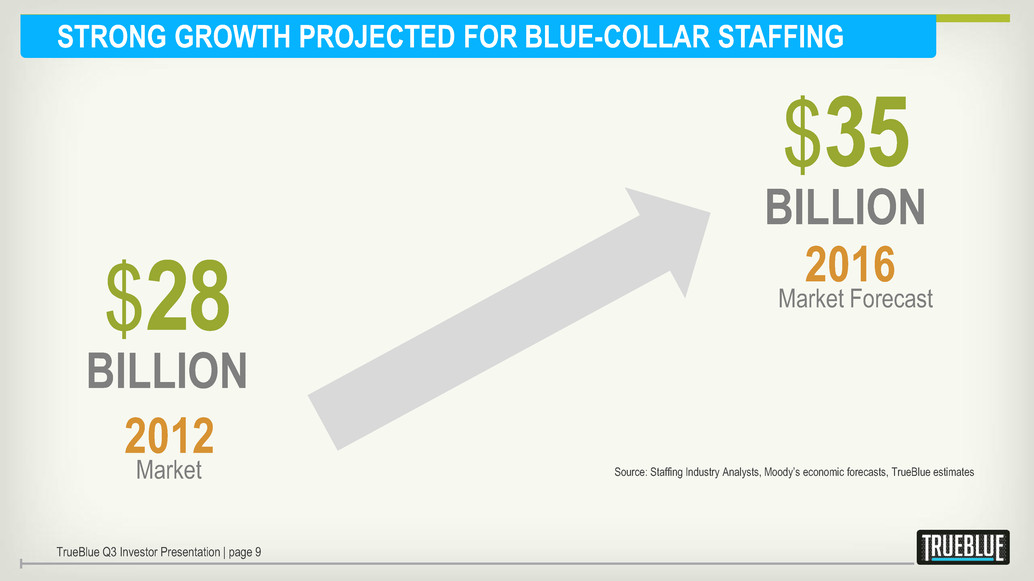 BLUE-COLLAR STAFFING: $28 BILLION INDUSTRY $100 Billion Overall Industry $28B OFFICE IT FINANCE HEALTHCARE OTHER LIGHT INDUSTRIAL / BLUE-COLLAR STAFFING TrueBlue Q3 Investor Presentation | page 8 Source: Staffing Industry Analysts, TrueBlue estimates